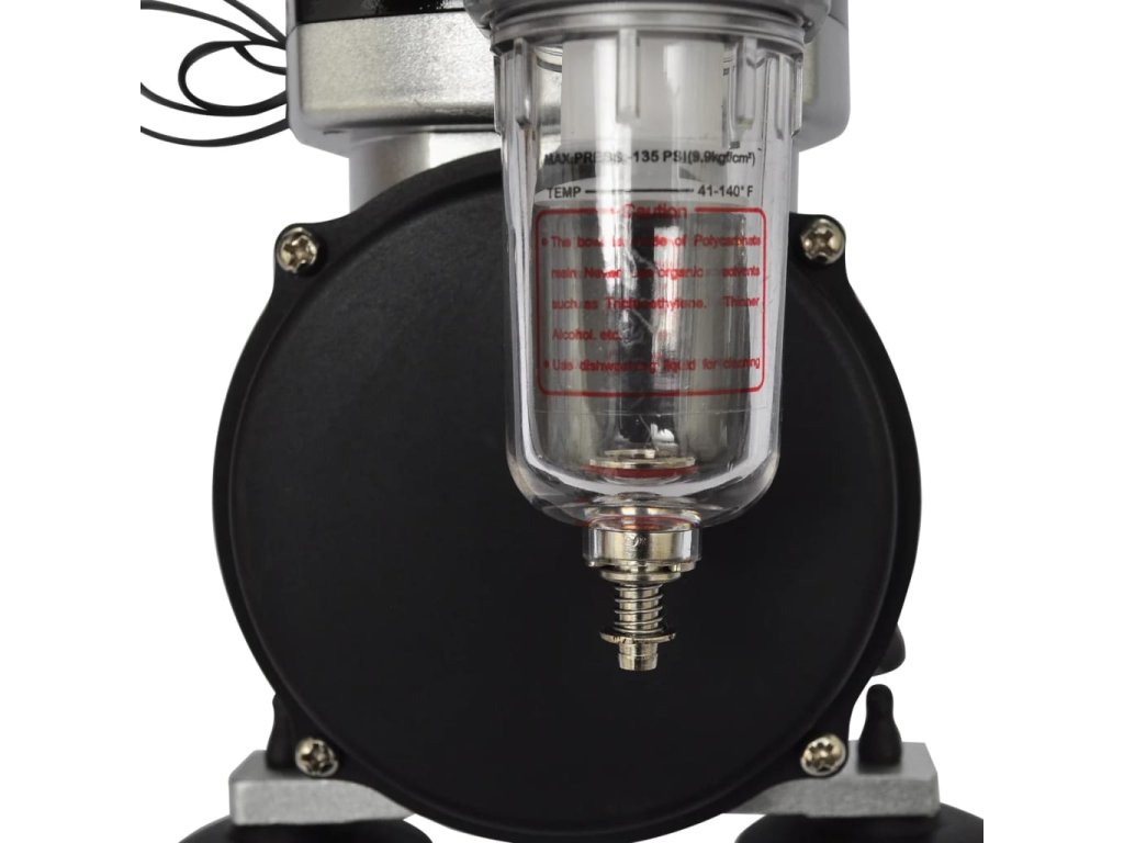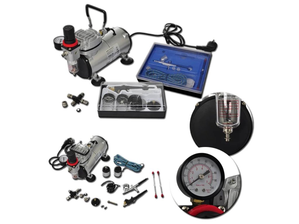 Tento bezolejový pístový kompresor s regulací vzduchu, vzduchovým filtrem a manometrem je vhodný pro všechny typy airbrush s tryskou o velikosti 0,2 až 1,0 mm.
