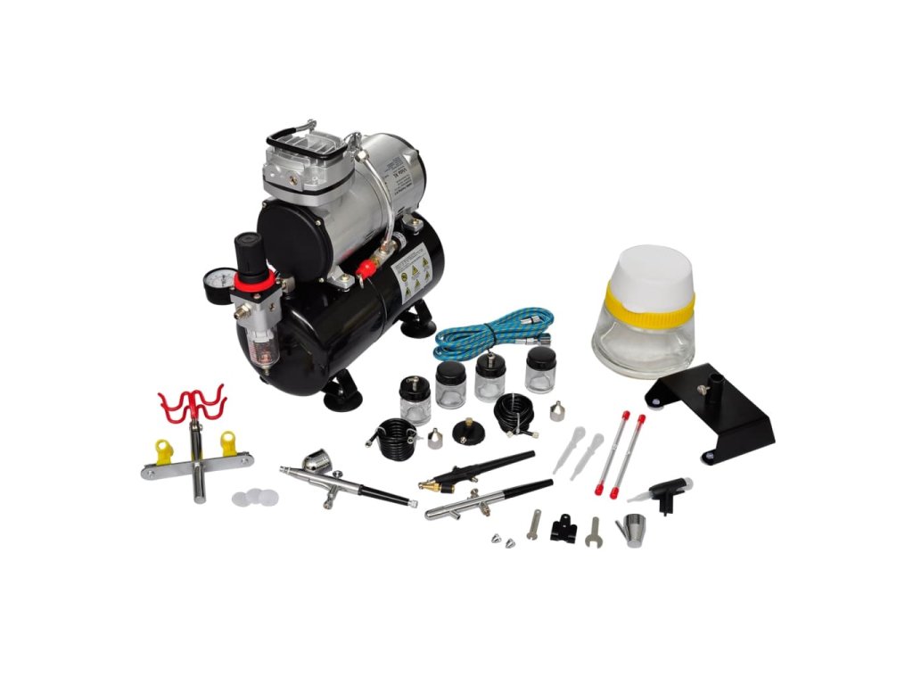 Dodávka zahrnuje 1x mini kompresor s 3litrovou nádrží na vzduch, regulátor komprese, vzduchový filtr, manometr a originální krabičku, 1x airbrush se 7dílnou sadou s jednoduchou funkcí v úložné krabici, 1x airbrush s 8dílnou sadou s dvojitou funkcí v úložné krabici, 1x airbrush s 9dílnou sadou s dvojitou funkcí v úložné krabici,