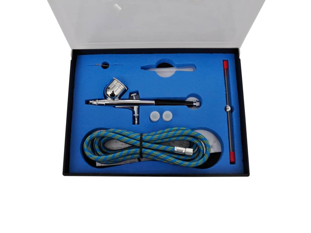 Celý set obsahuje airbrush pistoli s jemnou hlavicí, 150cm vinylovou hadici, 60ml nádobku s víčkem, přiloženou 22 ml. nádobku, klíč, regulátor pohonu a adaptér (vzduchová hadice 0,6 mm od kompresoru k hadici menší stříkací pistole).