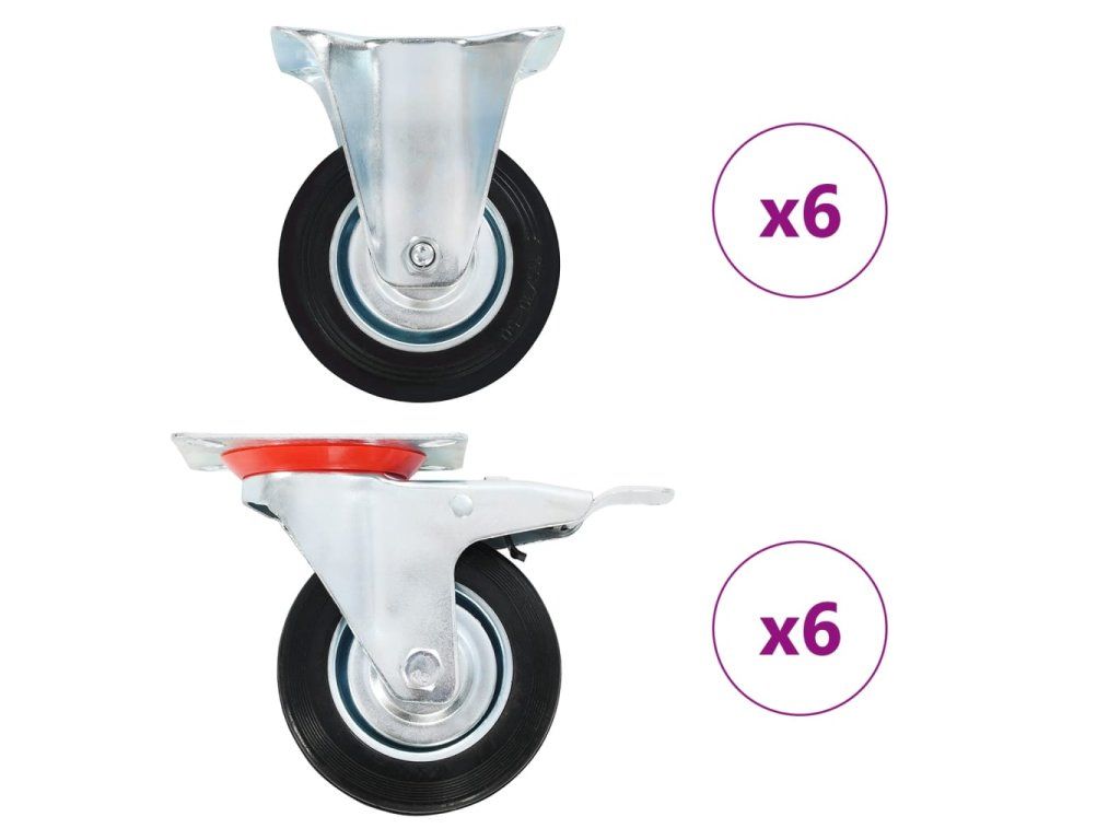 - Balení obsahuje 6 pevných koleček a 6 otočných koleček s brzdou.
