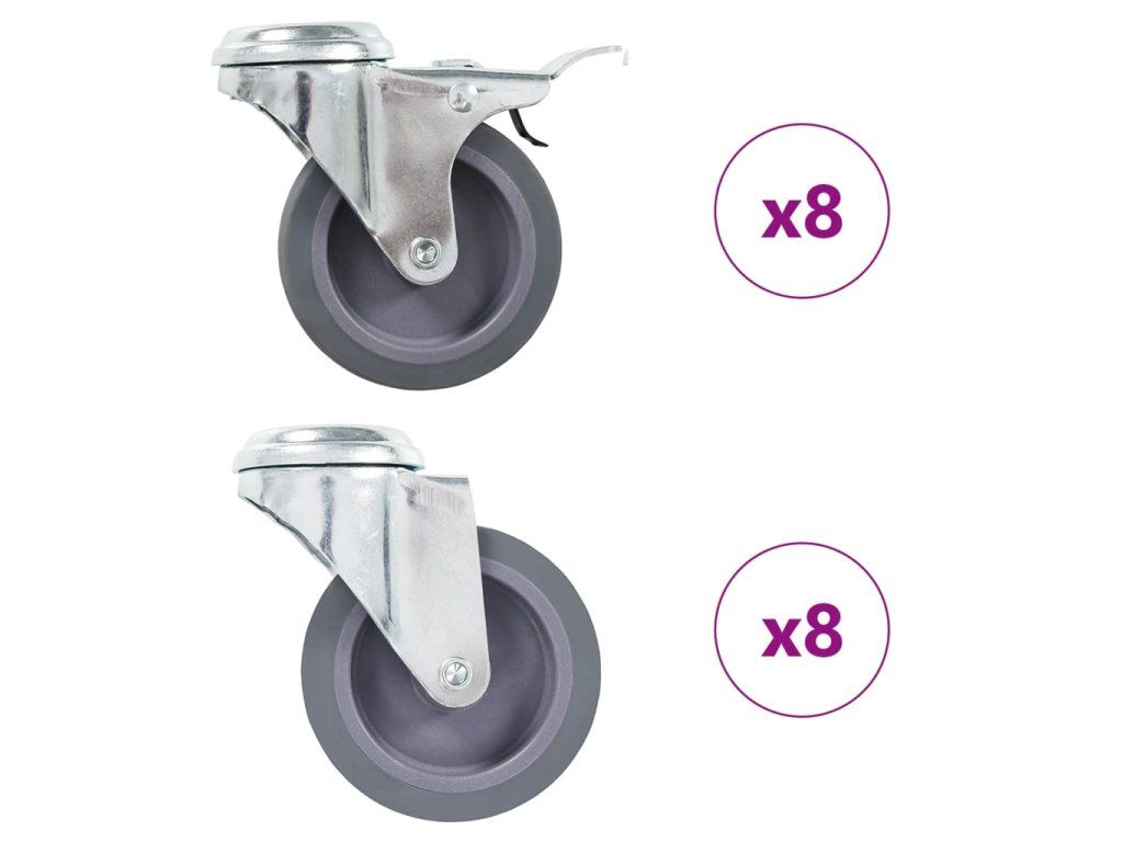 Balení obsahuje 8 otočných koleček s otvorem pro šroub a 8 otočných koleček s otvorem pro šroub a brzdou.