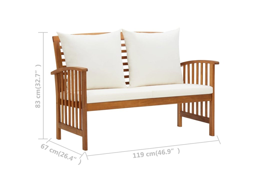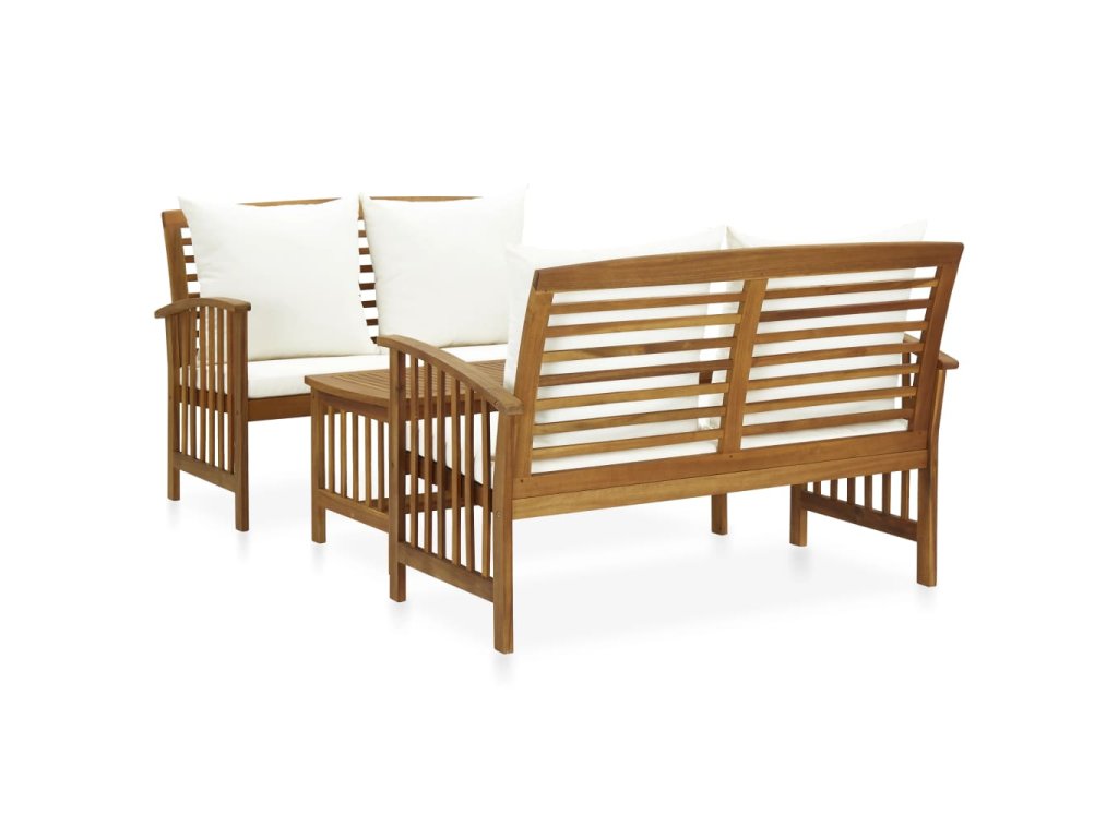 Set zahradního nábytku je zhotovený z masivního akáciového dřeva s olejovou úpravou, je stabilní a má dlouhou životnost. Tlusté podušky na sedák a opěradlo poskytují měkké posezení. Konferenční stolek s masivní dřevěnou stolní deskou s lamelovým designem poslouží jako perfektní odkládací plocha pro vaše občerstvení, mísy s ovocem, dekorativní předměty a další nezbytnosti. Na lavičce s lehce zaobleným opěradlem a loketními opěrkami se velmi pohodlně sedí.