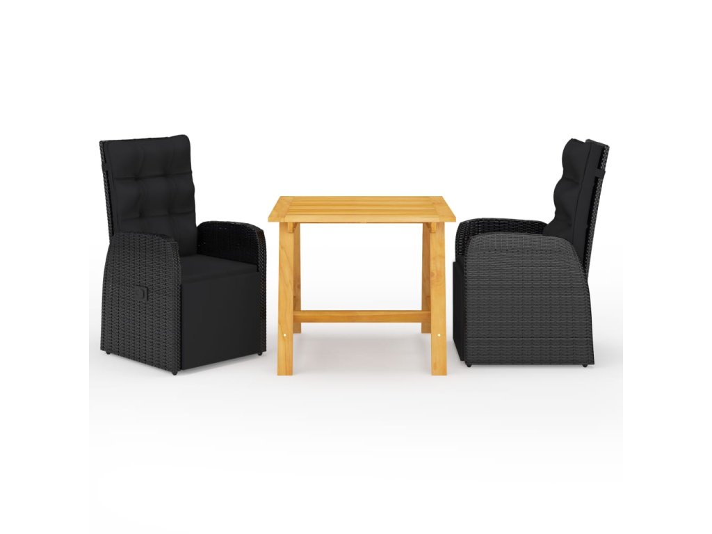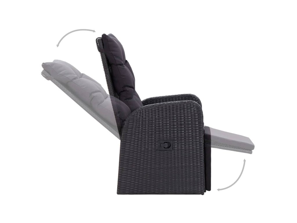 Jídelní stůl je zhotovený z masivního akáciového dřeva s olejovaným povrchem, takže je stabilní, odolný a nenáročný na údržbu. Bytelné jídelní židle mají rám z práškově lakované oceli, opletený PE ratanem, který výborně vzdoruje klimatickým vlivům a snadno se čistí. S polohovatelným opěradlem a opěrkou nohou vám nic nebude bránit v příjemném odpočinku. Opěradlo lze sklopit zatažením za tlačítko na boku. Židle mají lehkou konstrukci, není tedy problém je přesunout, kam potřebujete. Navíc jsou opatřené mimořádně pohodlnými, hustě polstrovanými poduškami pro maximální komfort. Jejich polyesterové potahy nevyžadují téměř žádnou údržbu a dají se stáhnout a vyprat.