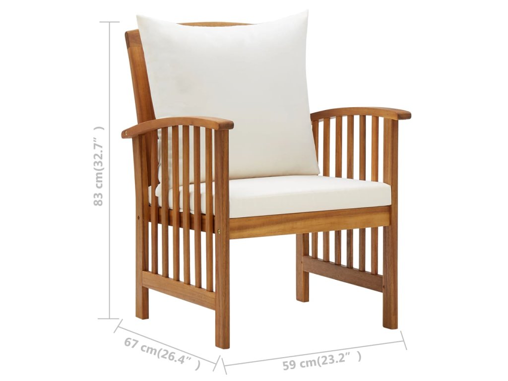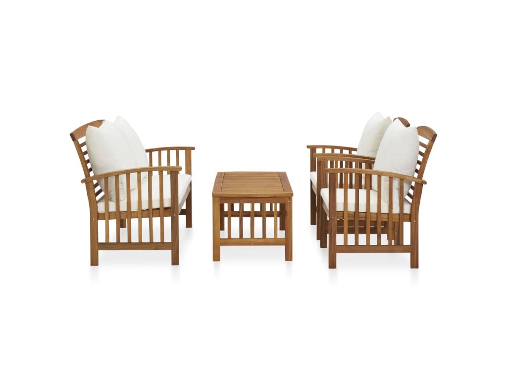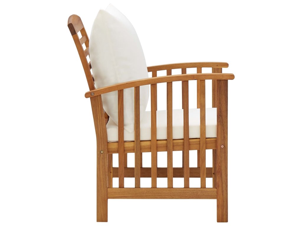 Set zahradního nábytku je zhotovený z masivního akáciového dřeva s olejovou úpravou, je stabilní a má dlouhou životnost. Tlusté podušky na sedák a opěradlo poskytují měkké posezení. Konferenční stolek s masivní dřevěnou stolní deskou s lamelovým designem poslouží jako perfektní odkládací plocha pro vaše občerstvení, mísy s ovocem, dekorativní předměty a další nezbytnosti. Na lavičce a židlích s lehce zaobleným opěradlem a loketními opěrkami se velmi pohodlně sedí.