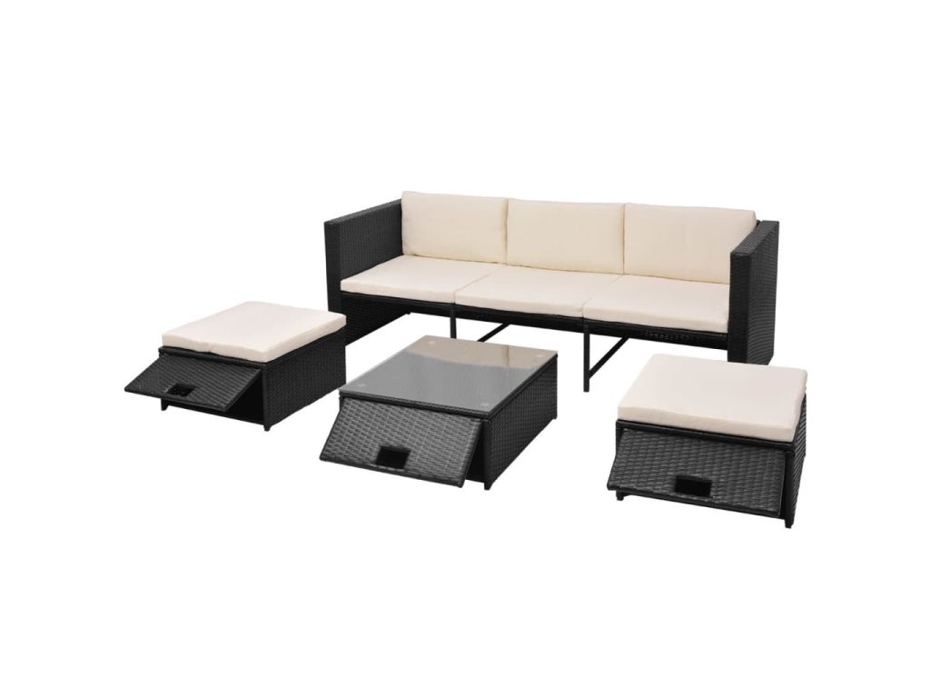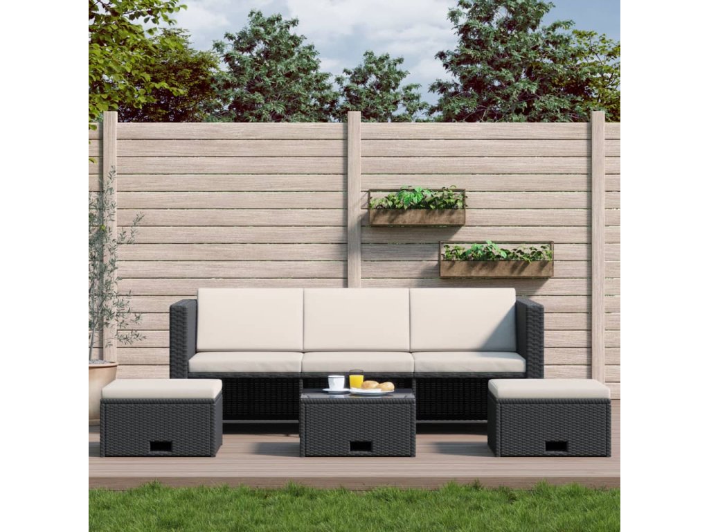 Ratan, ze které je tato sestava zahradního nábytku zhotovená, je odolný vůči vodě a povětrnostním vlivům, snadno se čistí, je rezistentní a vhodný pro každodenní používání. Stolní deska z tvrzeného skla se rovněž snadno čistí vlhkým hadříkem. Sedací souprava má robustní ocelové rámy s práškovým nástřikem, takže je vysoce odolná. Zároveň má nízkou hmotnost, takže tuto modulární sadu můžete snadno přemisťovat. Tlusté odnímatelné polstry na sedáky a opěradla jsou velmi pohodlné a pratelné. Stolek a podnožky mají velké úložné prostory na všechny vaše časopisy, drobnosti a další věci, abyste je mohli mít uklizené, a přitom po ruce. Stůl a podnožky se dají úhledně zasunout pod pohovku pro úsporu místa, když je zrovna nepoužíváte. Jejich vysouvání a zasouvání je velmi snadné.