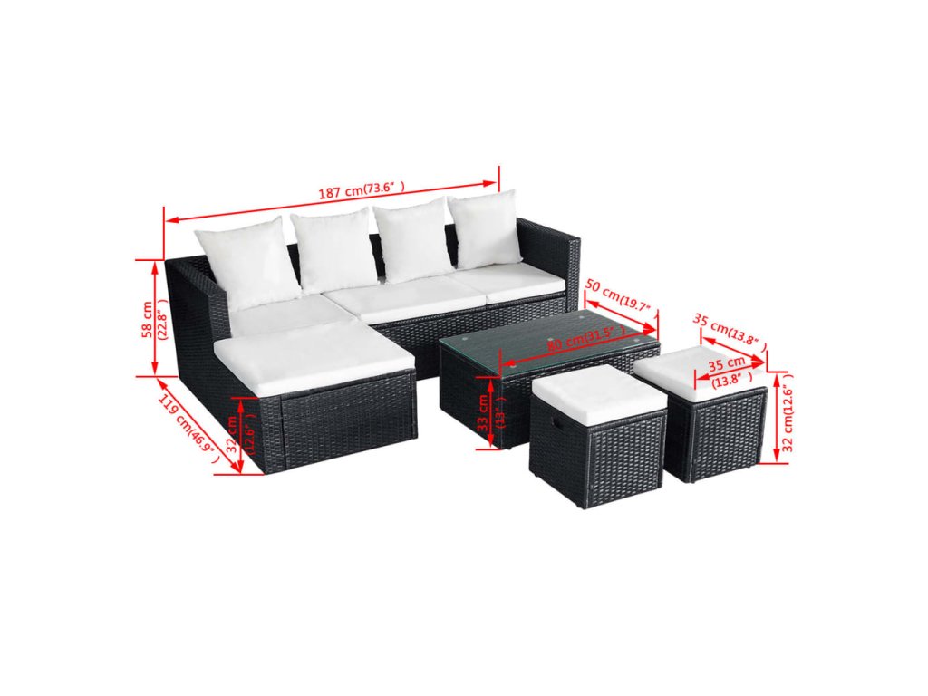 Součástí balení je rohová pohovka, konferenční stolek, dva taburety, čtyři polštáře a čtyři podušky. Poznámka: Doporučujeme soupravu za deště, sněhu a mrazu přikrýt.