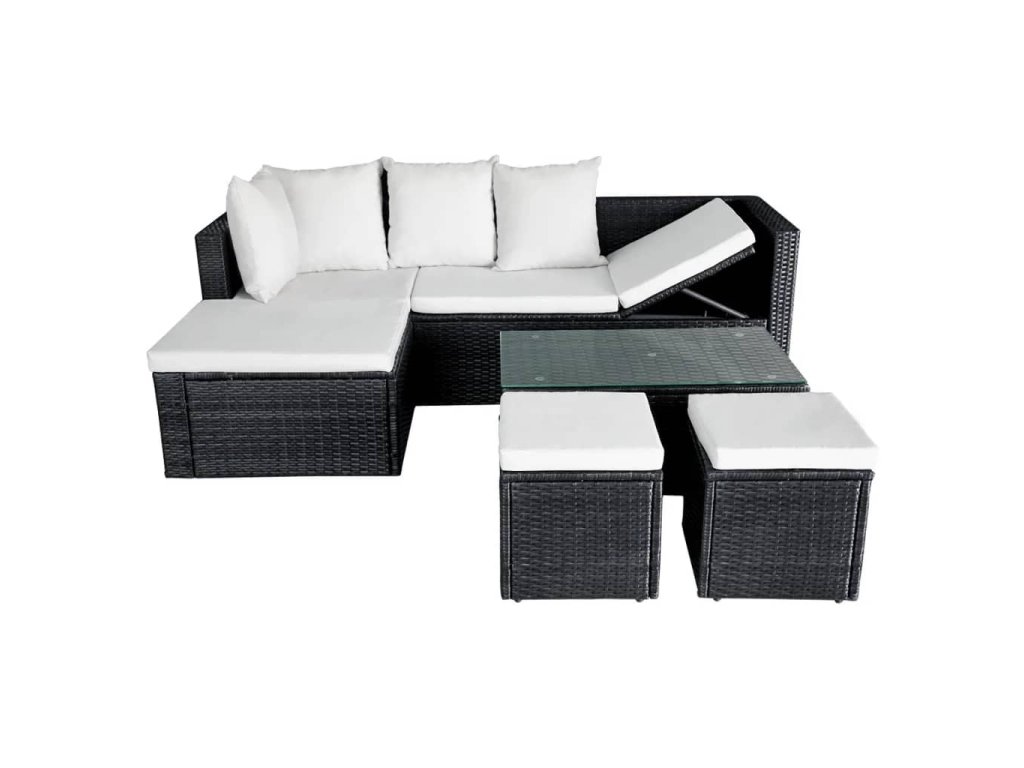 Tato sada je dodávána s velmi pohodlnými, silně polstrovanými polštářky a poduškami. Povlaky na polštáře a podušky jsou odnímatelné a omyvatelné. Navíc může být jedna strana rohové pohovky přesunuta a sedadlo lze nastavit do třech různých úrovní pro nejpohodlnější polohu.