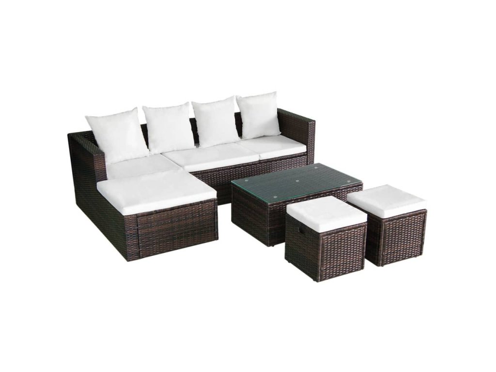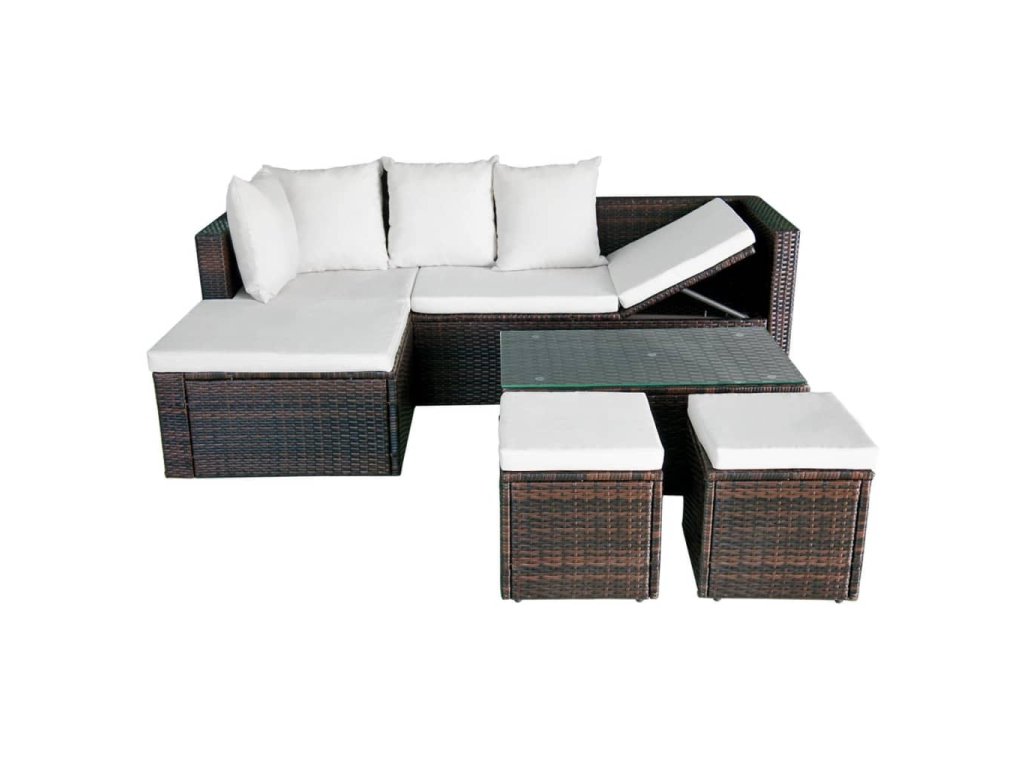 Součástí balení je rohová pohovka, konferenční stolek, dva taburety, čtyři polštáře a čtyři podušky. Poznámka: Doporučujeme soupravu za deště, sněhu a mrazu přikrýt.