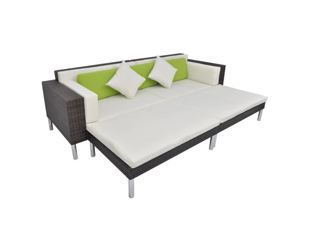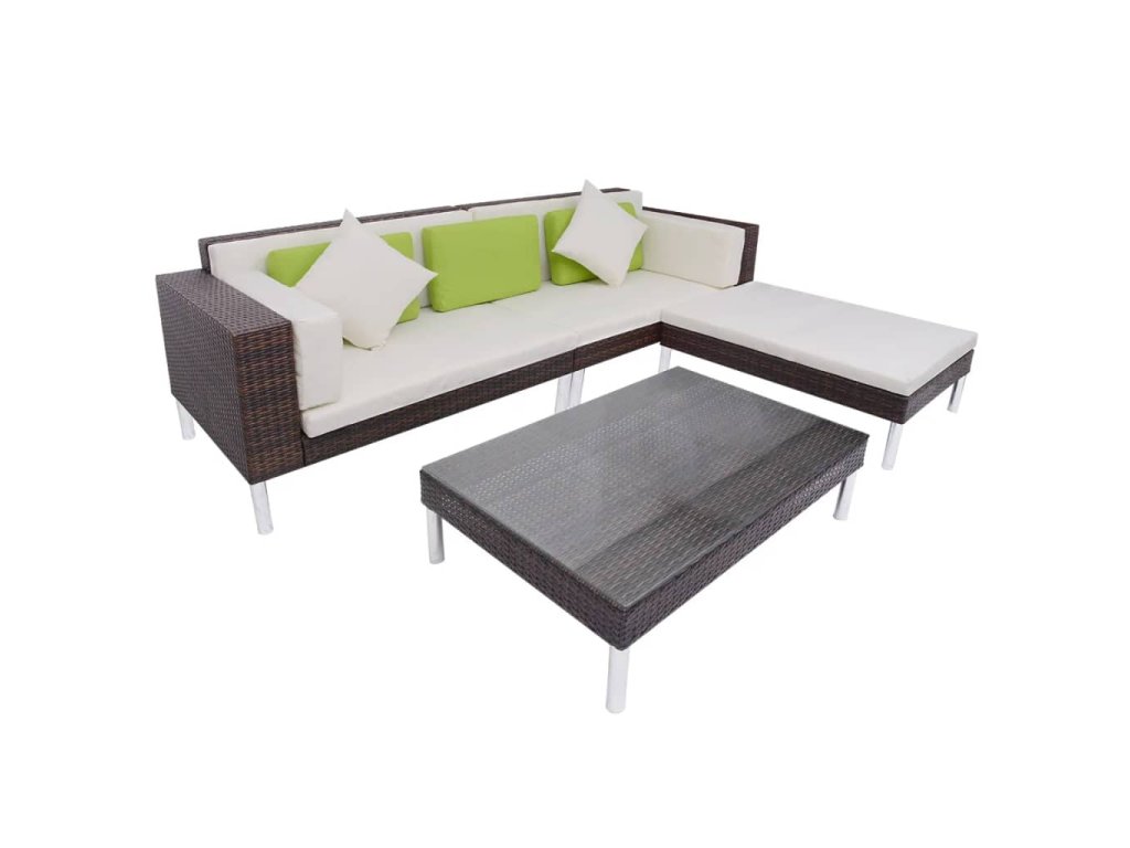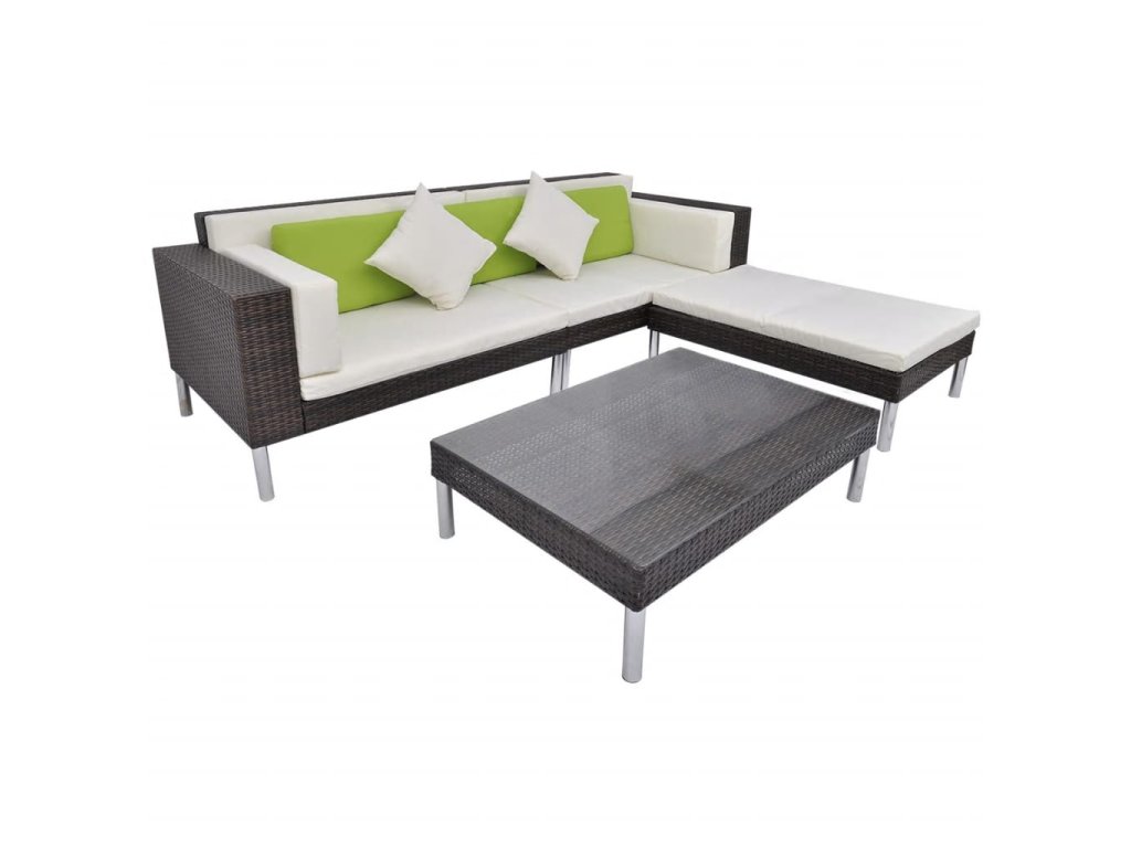 Balení obsahuje 2 rohové pohovky, 1 taburet, 1 konferenční stolek, 4 podušky na sedáky, 2 podušky na opěradla, 3 zelené polštáře a 2 krémově bílé polštáře. Poznámka: Doporučujeme soupravu v dešti, sněhu a mrazu přikrýt.