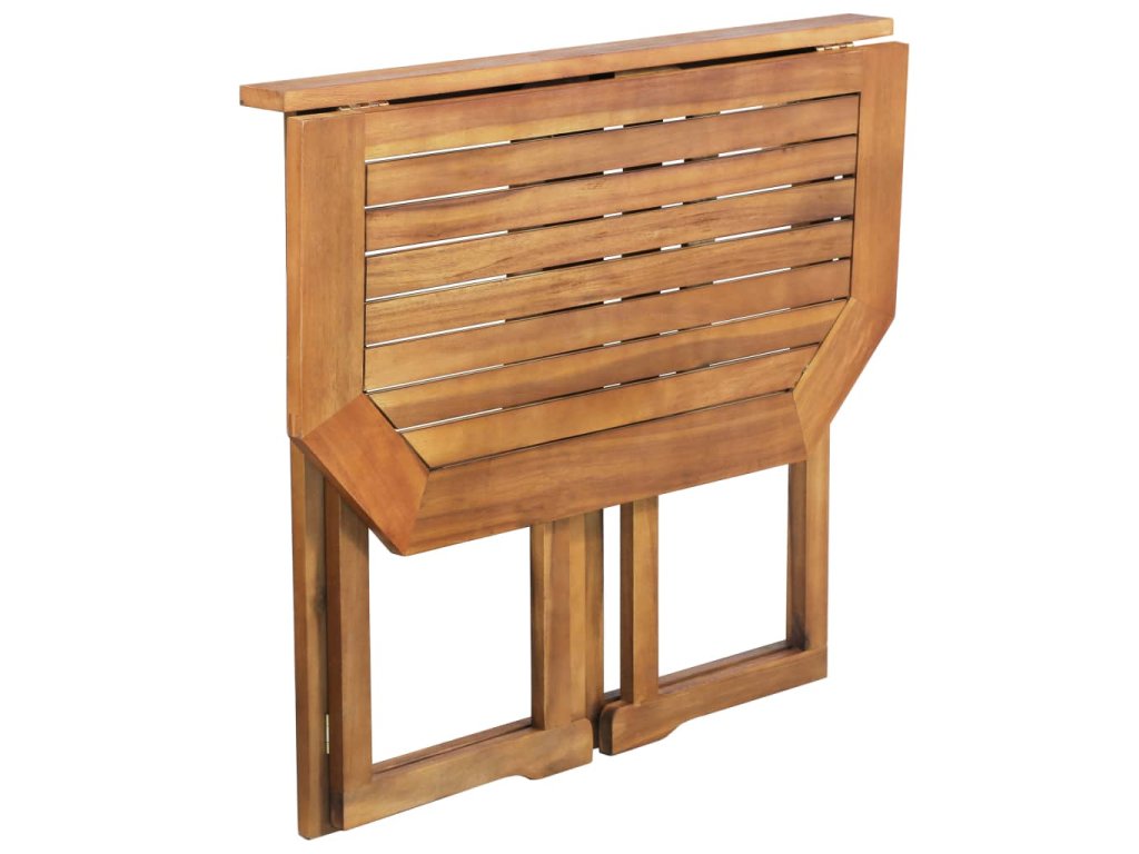 Set je vyrobený z masivní akácie, tvrdého tropického dřeva, které je odolné vůči klimatickým vlivům a má velmi dlouhou životnost, proto se hodí k venkovnímu použití. Povrch stolu je ošetřený olejem, takže se snadno čistí, postačí vám k tomu navlhčený hadřík. Stůl i židle jsou skládací pro snadnou úschovu a přenášení.
