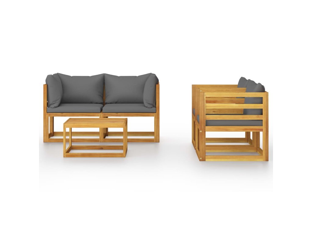 Rám z masivního akáciového dřeva je pevný, odolný a má dlouhou životnost. Dřevo je napuštěné olejem, sedací souprava je proto vhodná i pro venkovní použití. Odnímatelné podušky na sedáky a opěradla jsou silně polstrované, takže se vám na nich bude nesmírně dobře sedět. Součástí balení je také konferenční stolek v unikátním laťkovém provedení. Nevšední modulární design vám umožní všechny díly přestavovat a upravovat dle momentálních potřeb.