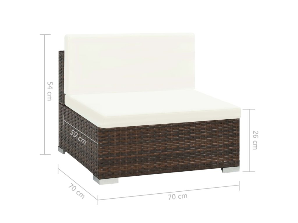 Tato polyratanová sedací souprava se skládá z 1 rohové pohovky, 3 středových pohovek, 1 konferenčního stolku, 1 taburetu, 5 polštářů za záda a 5 podušek na sedáky. Pomůže vám vytvořit stylové posezení na vaší zahradě či terase.