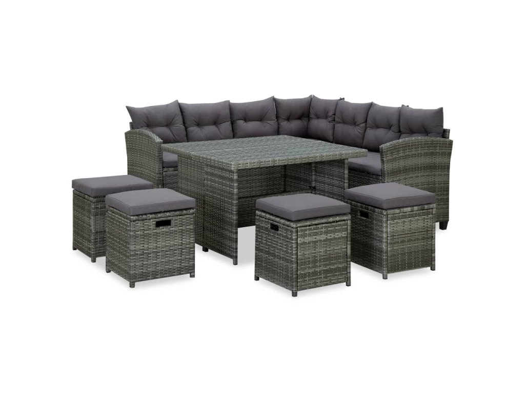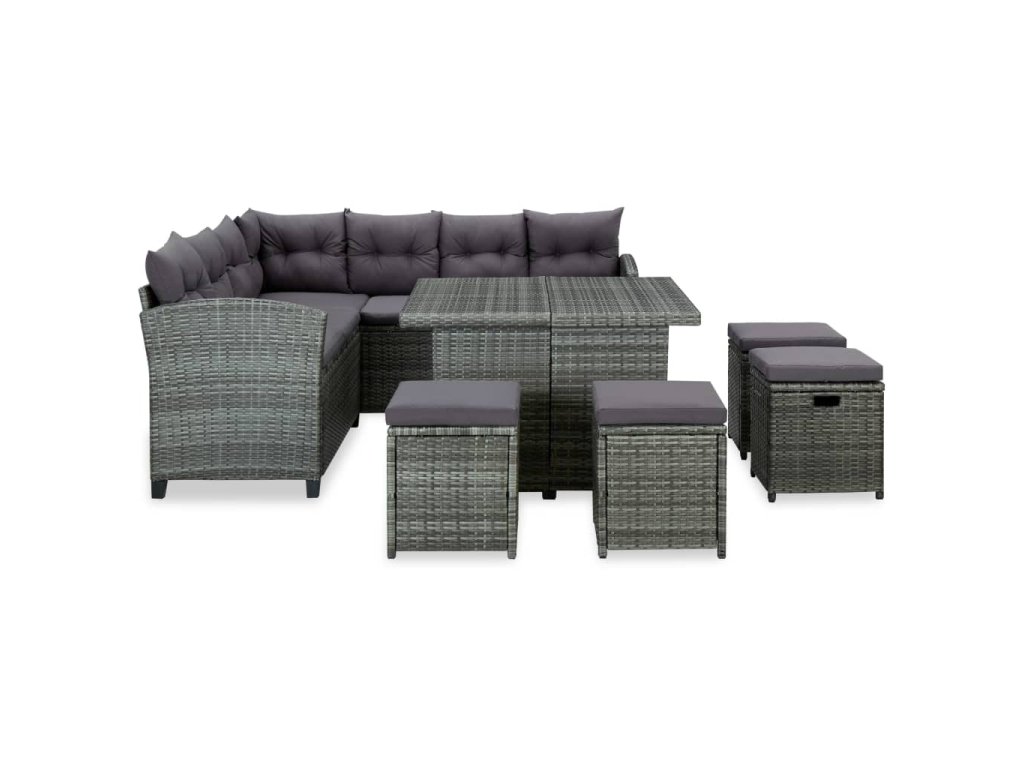 Tato pohodlná venkovní sedací souprava má ocelový rám s práškovým nástřikem, který je potažený PE ratanem, je robustní a snadno se čistí, takže je ideální pro každodenní venkovní použití. Zahradní nábytek má lehkou konstrukci, takže ho můžete snadno přesouvat. Na silně polstrovaných poduškách můžete lenošit v extra pohodlí. Rohová pohovka a stoličky poskytují dostatek místa k sezení pro rodinná setkání. Konferenční stolek je navíc ideální pro odkládání nápojů, jídla a dekorací.