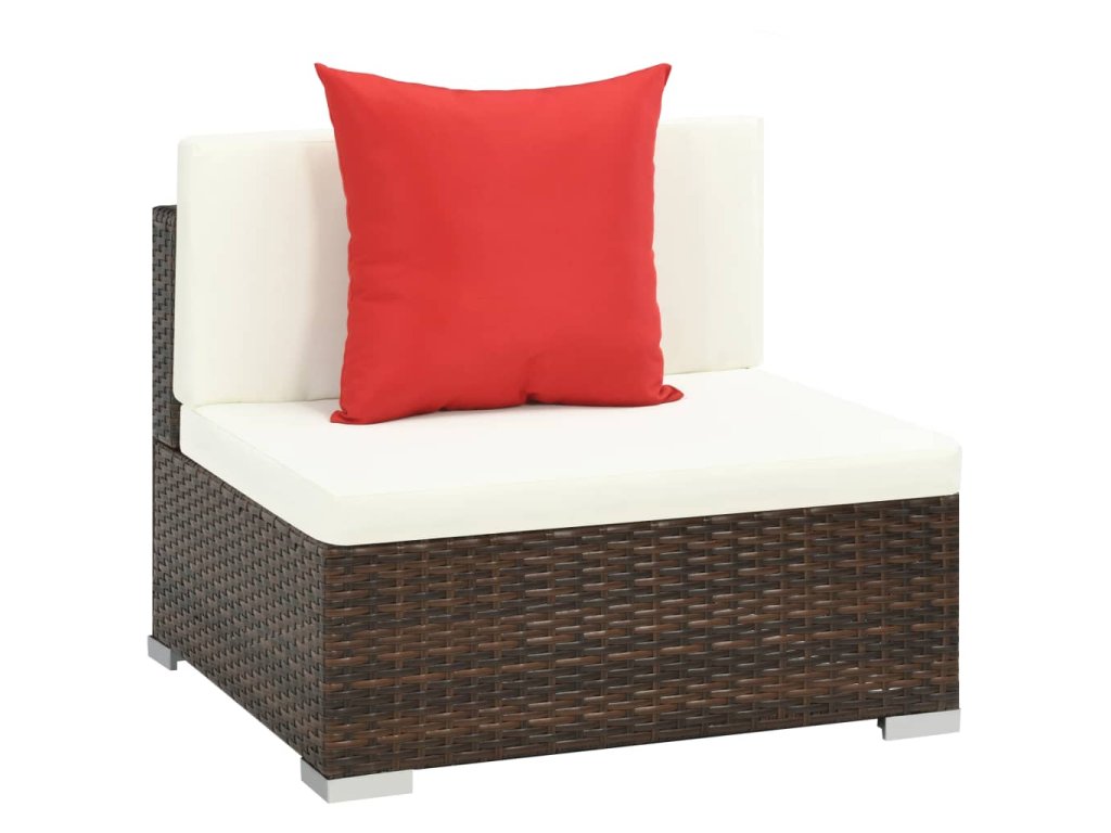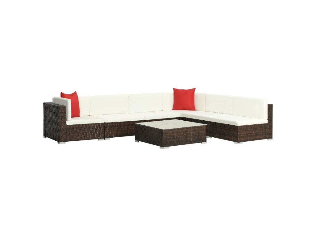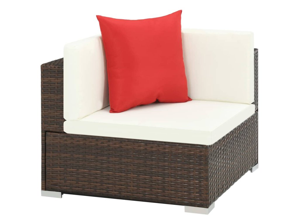 Tato polyratanová sedací souprava sestává ze 2 rohových pohovek, 4 středových pohovek, 1 konferenčního stolku, 8 polštářů za záda, 6 podušek na sedáky a 2 zajímavých červených polštářků. Pomůže vám vytvořit stylové posezení na vaší zahradě či terase.