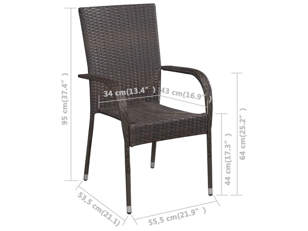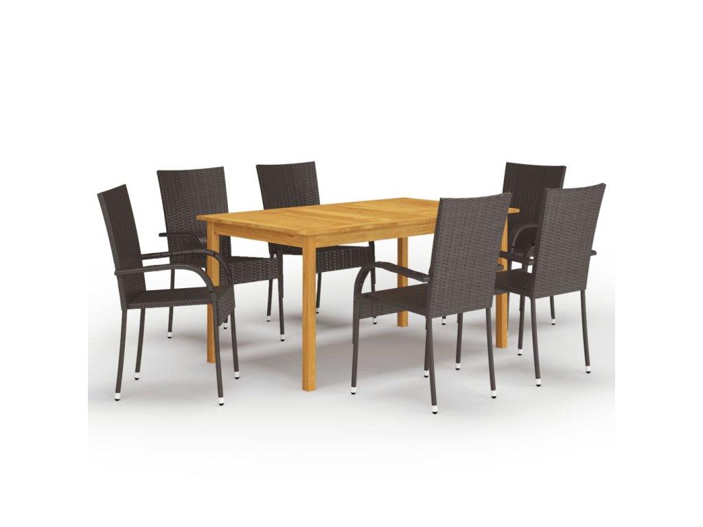 Jídelní stůl je zhotovený z masivního akáciového dřeva s olejovaným povrchem, takže je stabilní, odolný a nenáročný na údržbu. Zahradní židle mají rám z práškově lakované oceli, opletený PE ratanem, který výborně vzdoruje klimatickým vlivům. Dlouho vám proto vydrží a snadno je očistíte. Jídelní židle mají také lehkou konstrukci a lze je stohovat, aby vám zbytečně nepřekážely, když je zrovna nepoužíváte.