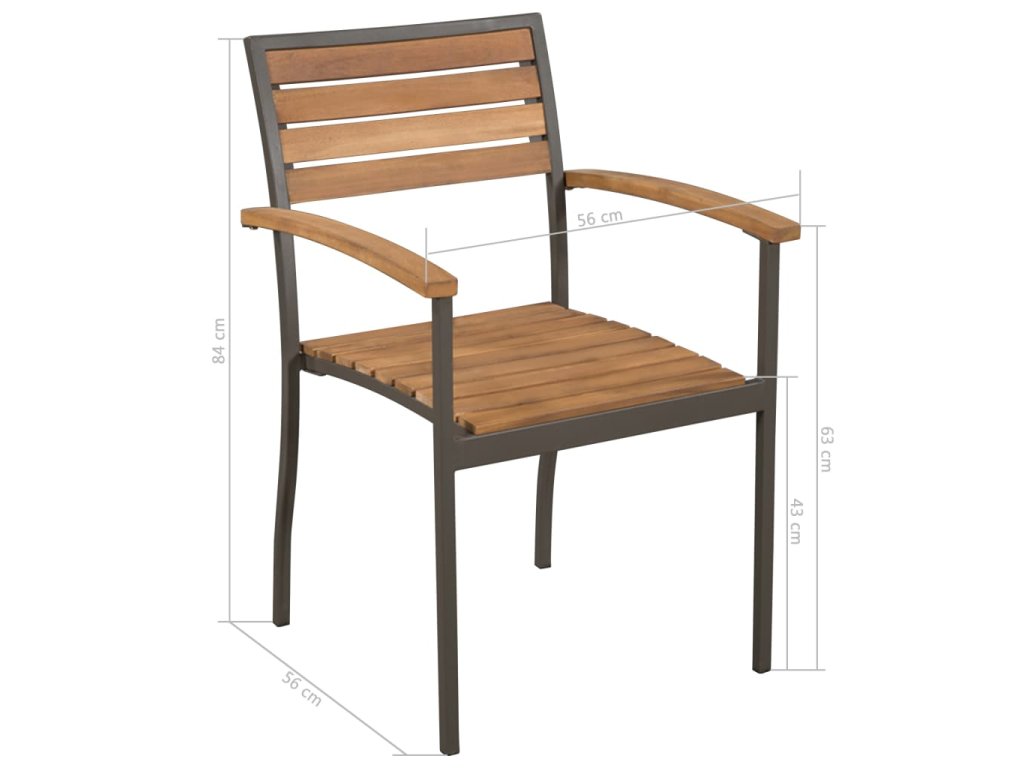 Stůl i židle jsou vyrobeny z masivního akáciového dřeva ošetřeného olejem a s laťkovým designem. Ocelové rámy zajišťují jejich pevnost a stabilitu, a navíc jim propůjčují industriální vzhled. Pokud je právě nepoužíváte, je možné židle stohovat, což vám ušetří místo.