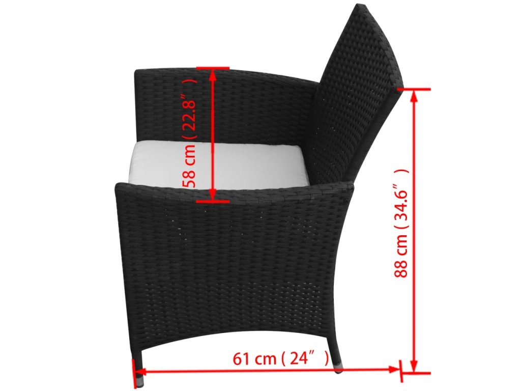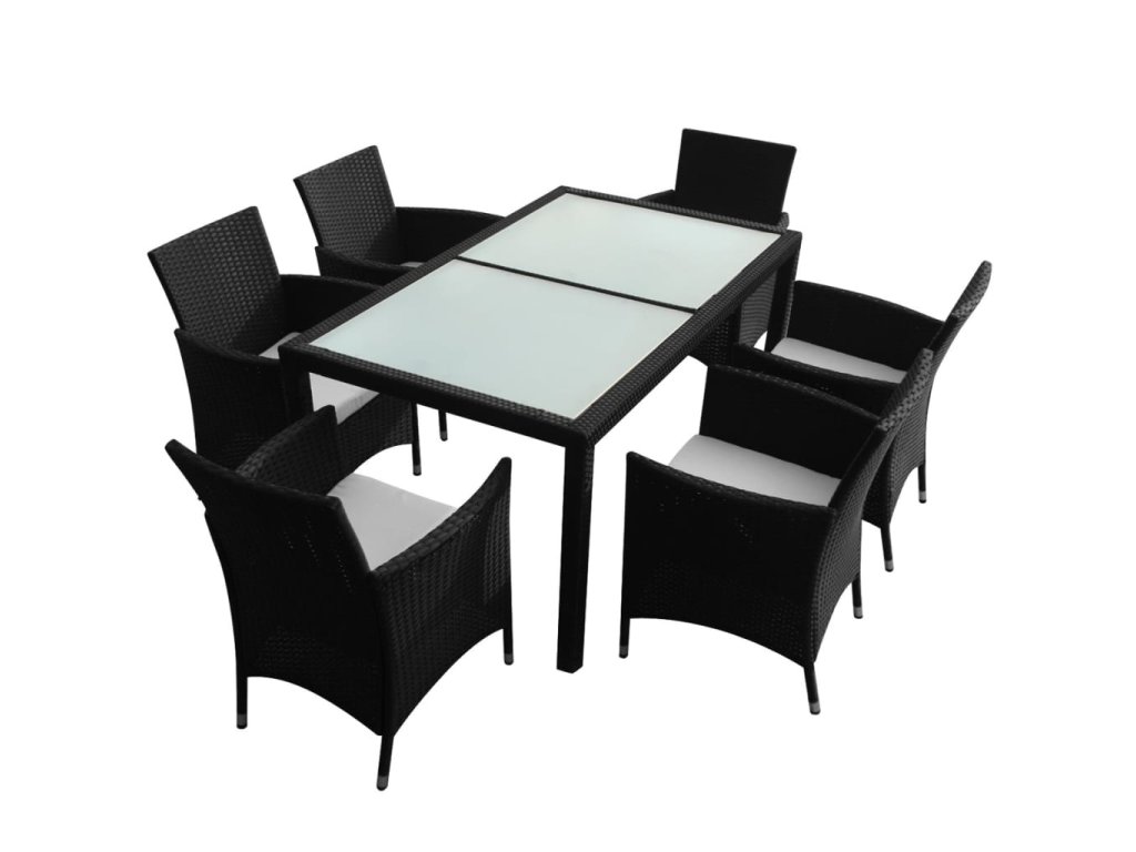 - Balení obsahuje 1 stůl se skleněnou deskou, 6 ratanových židlí a 6 odnímatelných polstrů na sedáky