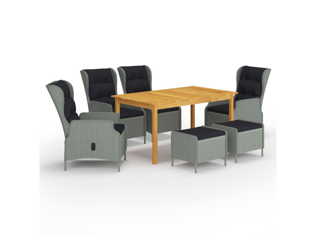 Jídelní stůl je zhotovený z masivního akáciového dřeva s olejovaným povrchem, takže je stabilní, odolný a nenáročný na údržbu. Zahradní židle a stolička mají rám z práškově lakované oceli, opletený kulatým PE ratanem, dlouho vám proto vydrží a snadno je očistíte. Hustě polstrované podušky vám při odpočinku zaručí mimořádný komfort. Jejich potahy jsou opatřené zipem, abyste je mohli bez námahy stáhnout a oprat. Židle disponují mechanismem s plynovým pístem, umožní vám tedy také nastavit opěradlo do různých poloh. Stačí stisknout tlačítko na boku a opěradlo se sklopí do pohodlné pozice vleže. Vzhledem k lehké konstrukci lze jídelní židle i stoličku jednoduše přesouvat, kam potřebujete.