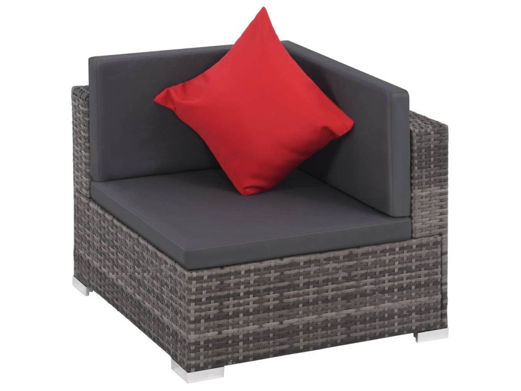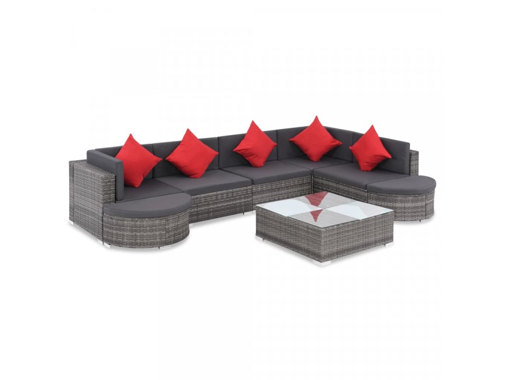 Tato polyratanová sedací souprava je složená ze 2 rohových pohovek, 3 středových pohovek, 1 konferenčního stolku, 2 půlkruhových stoliček, 5 výrazných červených polštářů a 14 podušek. Pomůže vám vytvořit stylové posezení na vaší zahradě či terase.