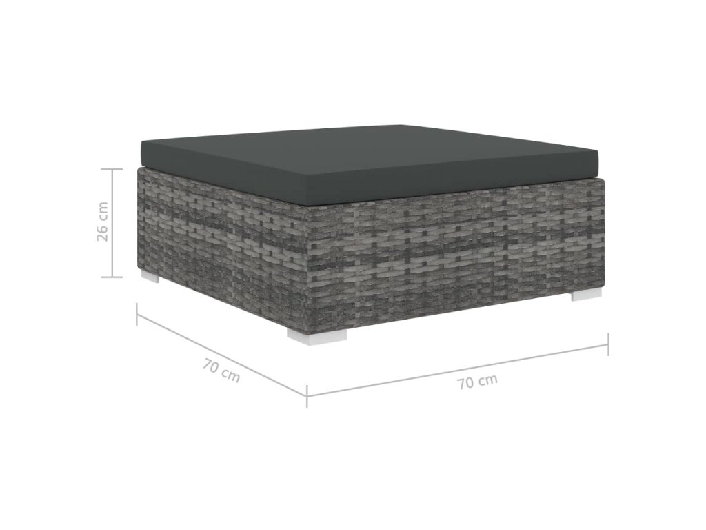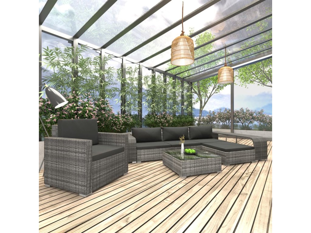 Souprava je složená z 8 dílů, které můžete vzájemně přemisťovat a kombinovat podle vašich představ. Nábytek je vyrobený z odolného polyratanu, ručně vyplétaného na práškově lakovaný ocelový rám. Souprava je pevná, robustní a klimaticky odolná. PE ratan vzdoruje všem rozmarům počasí, snadno se čistí, je odolný vůči opotřebení a vhodný pro každodenní použití. Hustě polstrované podušky a extra hluboké moderní sedáky vás budou lákat k příjemné relaxaci. Potahy podušek mají povlaky se zipy, takže je lze sejmout a vyprat.