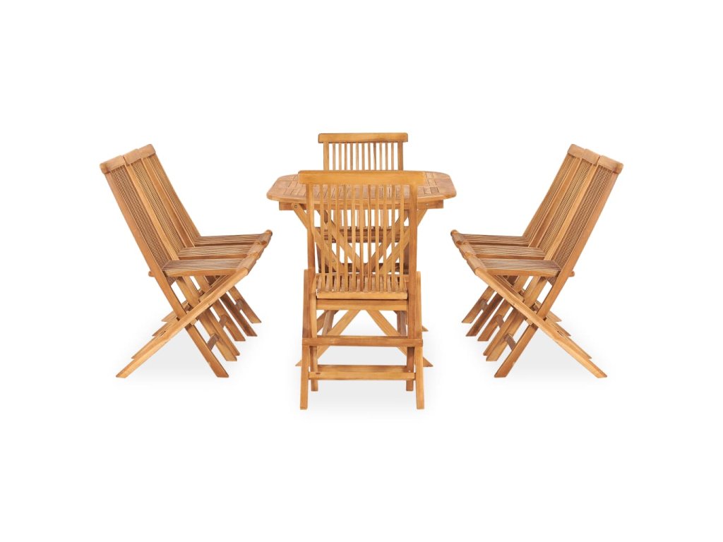 Nábytek je zhotovený z extrémně odolného teakového tvrdého dřeva, které již prošlo procesem smršťování, bylo uměle vysušené a poté jemně a dohladka obroušené. Toto dřevo je oceňované pro svou výjimečnou pevnost a klimatickou odolnost, a proto je zdaleka nejvhodnějším materiálem pro výrobu zahradního nábytku. Jedná se o skvělou volbu, pokud si chcete pořídit zahradní vybavení, které vám vydrží sloužit dlouhá léta. Když jídelní stůl a židle zrovna nepoužíváte, můžete ji složit a ušetřit tak místo.