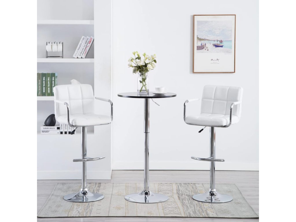 Sedák i opěradlo jsou čalouněné kvalitní umělou kůží, takže se vám na nich bude velmi pohodlně sedět. Pevný rám z chromované oceli navíc židlím zajišťuje mimořádnou odolnost a dlouhou životnost. Praktický mechanismus s plynovým pístem umožňuje nastavit si výšku stoličky dle vašich potřeb. Zabudované područky a opěrka nohou vám zase při sezení poskytnou dodatečnou oporu a maximální komfort.