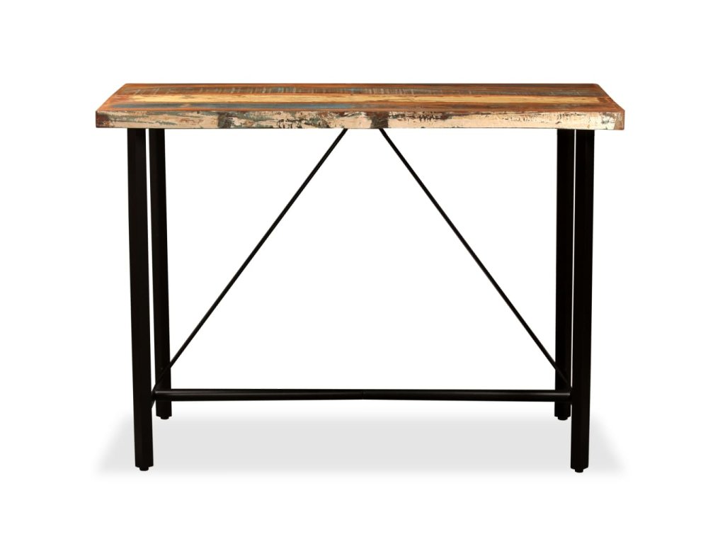 Barový stůl je vyrobený z masivního recyklovaného dřeva, takže má vlastnosti různých dřevin, jako jsou teak, mangovníkové dřevo, akácie atd. Recyklované dřevo je pevné, stabilní, odolné a také krásné. Známky opotřebení a řemeslného zpracování dávají každému kusu nábytku jedinečný charakter. Stůl je navíc celý ručně vyrobený. Silné ocelové nohy zajišťují stabilitu a odolnost stolu a umocňují jeho působivý industriální styl. Důležité upozornění: Kresba a odstín dřeva se mohou lišit kus od kusu, a proto je každý kus nábytku naprosto jedinečný. Výběr kusu k dodání je náhodný.