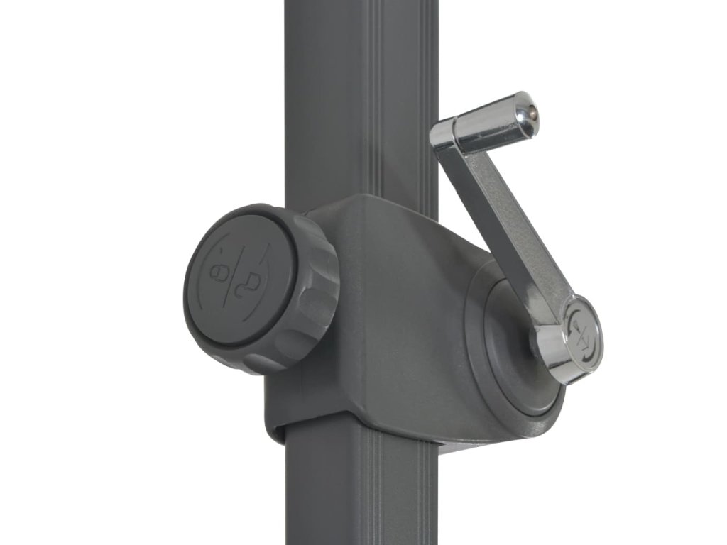 Stříška slunečníku je vyrobená z polyesterové tkaniny, která nepropouští škodlivé UV záření a nevybledne, takže vám poskytne optimální ochranu před sluncem. Navíc se snadno čistí. Exkluzivní konstrukce vám umožní slunečník naklánět a otáčet o 360 stupňů, aby blokoval slunce z jakéhokoli úhlu. Silná hliníková tyč spolu s 8 odolnými žebry zajišťuje, že se slunečník nehýbe a hodně toho vydrží. Zahradní slunečník disponuje klikovým mechanismem, takže se snadno otevírá i zavírá.
