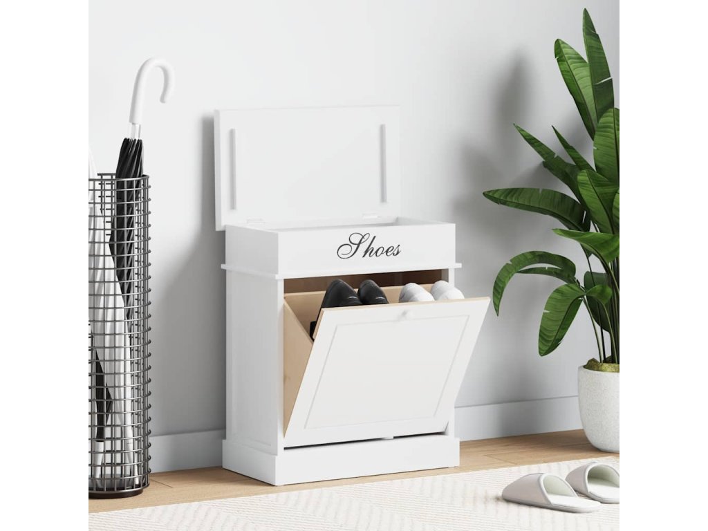 Skříňka je vyrobena ze dřeva pavlovnie, je tedy mimořádně odolná a stabilní. Velká vyklápěcí přihrádka je opatřena příčnými tyčemi, aby vše zůstalo na svém místě. Horní deska botníku se navíc dá odklopit, takže si do horní přihrádky můžete uschovat různé doplňky k obuvi, jako jsou tkaničky, vložky do bot a další maličkosti. Sestavení našeho botníku je snadné.