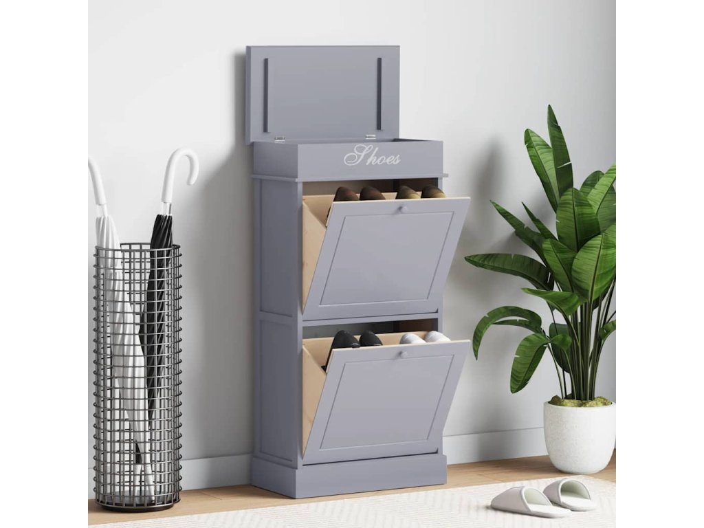 Dvě velké vyklápěcí přihrádky jsou opatřeny příčnými tyčemi, aby vše zůstalo na svém místě. To znamená, že si své boty můžete uspořádat, jak vám to vyhovuje, dobře na ně uvidíte a kdykoli je budete moci snadno vytáhnout. V botníku lze uložit až 10 párů bot, aniž by se na ně prášilo. Horní deska botníku se navíc dá odklopit, takže si do přihrádky pod ní můžete uschovat různé doplňky k obuvi, jako jsou tkaničky, vložky do bot a další maličkosti.