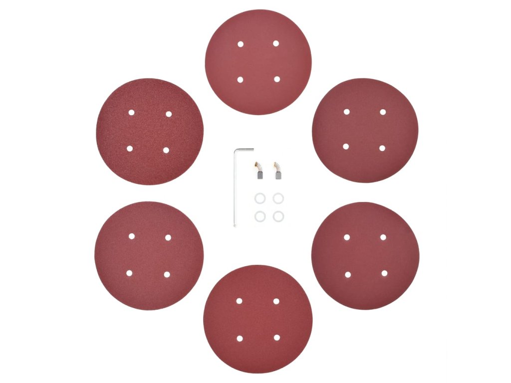 Příslušenství obsahuje 6 brusných papírových disků (80, 100, 120, 150, 180, 240 zrna), 2 uhlíkové kartáče, 1 hadici na prach, 1 šestihranný klíč a 1 sáček na sběr prachu.