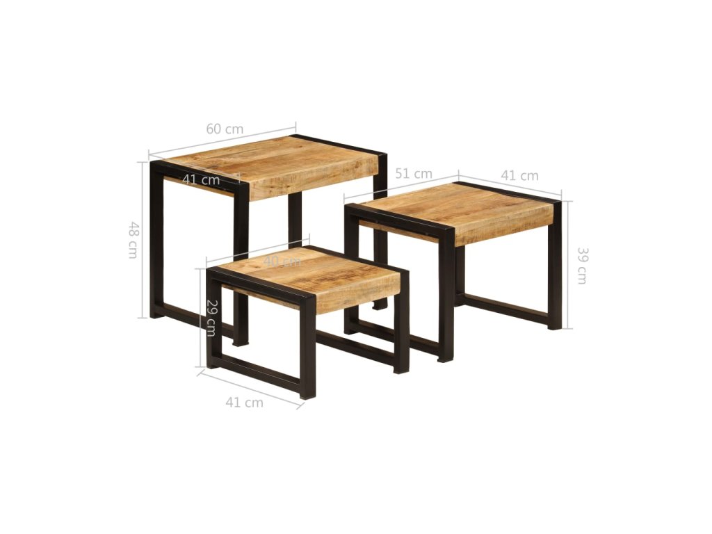 Tato sada 3 hnízdových vintage stolků je vyrobená z masivního mangovníku, je tudíž vysoce stabilní a odolná. Mangovníkové dřevo je husté a robustní tvrdé dřevo, které se na povrchu vyznačuje překrásnou hnědou či zlatou kresbou. Stolky mají zesílený ocelový rám, takže jsou nejen velmi stabilní a solidní, ale také mají velmi dlouhou životnost. Jelikož jsou stohovatelné, ušetříte spoustu místa, když je zrovna nebudete potřebovat. Zručné zpracování podtrhuje okázalý retro styl stolků. Každá fáze výrobního procesu je prováděna s mimořádnou péčí, ať už se jedná o leštění, natírání anebo lakování.