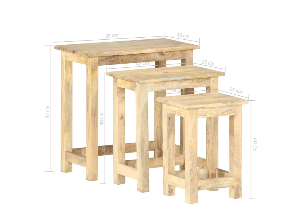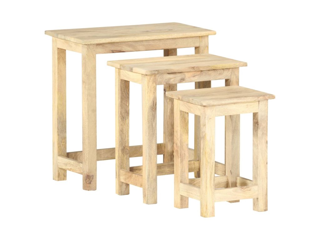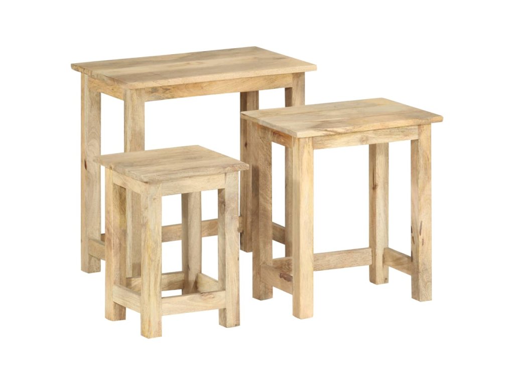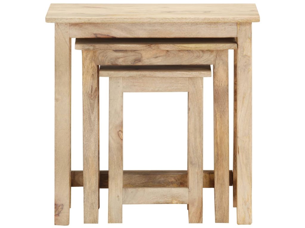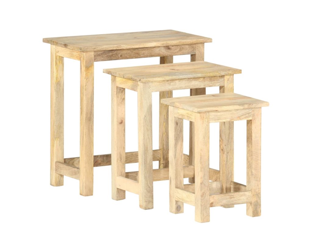 Sada 3 hnízdových stolků je vyrobená z prvotřídního mangovníkového dřeva, takže je každý z nich pevný, stabilní a má dlouhou životnost. Zřetelná kresba dřeva dává každému kusu nábytku jedinečný charakter, kterým se lehce liší od všech ostatních. Mangovník má husté a robustní tvrdé dřevo, jehož povrch se vyznačuje krásnými hnědými nebo zlatými pruhy a obrysy. Každý krok jeho zpracování byl navíc odborně a důsledně proveden, a to včetně řezání, leštění i natírání.