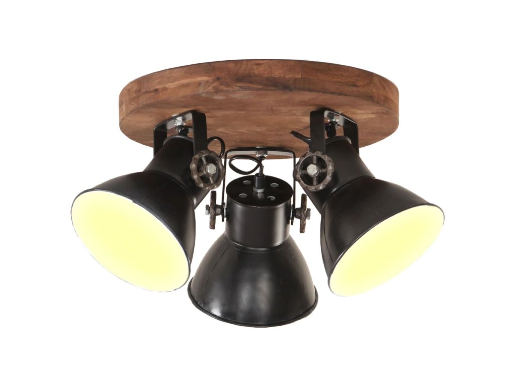 Železná stínidla s černým povrchem doplňuje starovenkovský hnědý odstín masivního mangovníkového dřeva, takže se skvěle hodí do každého venkovského či industriálního interiéru. Stropní svítidlo má 3 stínidla, do kterých je třeba namontovat žárovky s paticí E27 o maximálním výkonu 25 wattů. K instalaci si můžete vybírat ze žárovek E27 různých barev, abyste si doma navodili ideální atmosféru klidu a pohody.