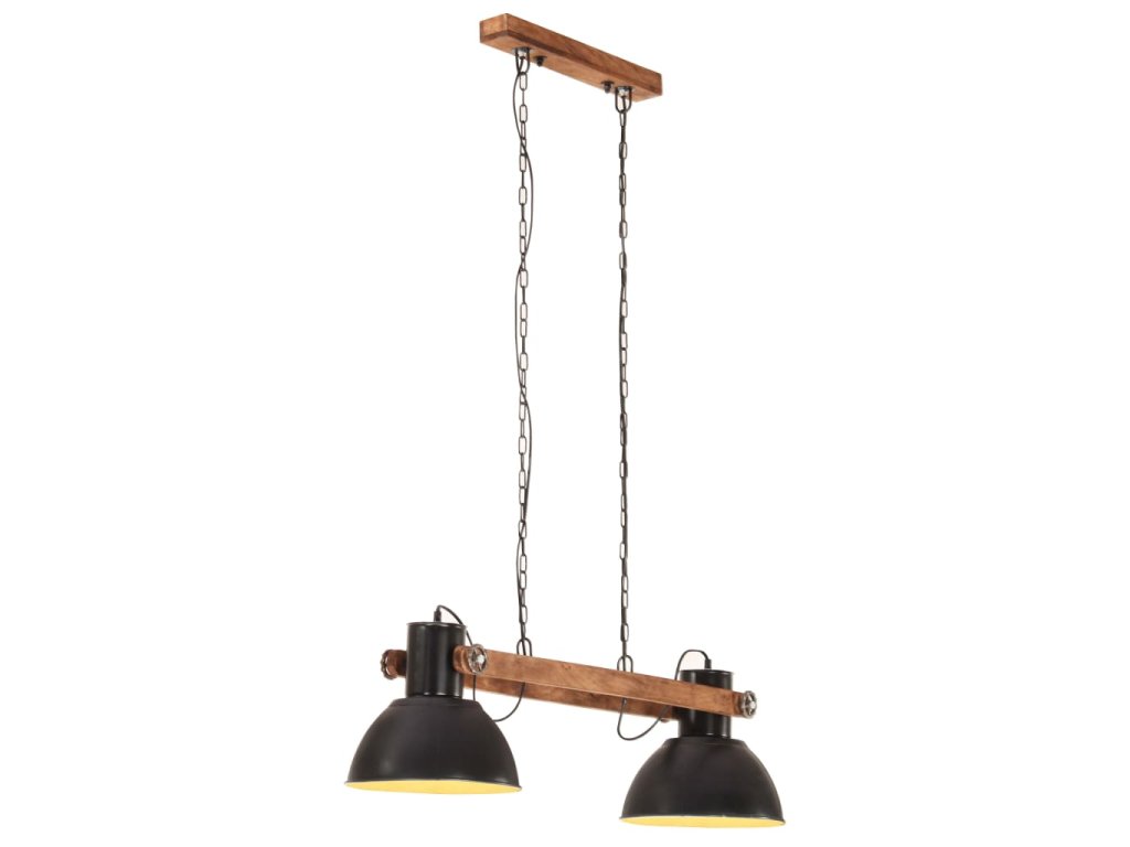 Železná stínidla s černým povrchem doplňuje starovenkovský hnědý odstín masivního mangovníkového dřeva, takže se skvěle hodí do každého venkovského či industriálního interiéru. Stropní světlo má 2 stínidla, do kterých je třeba namontovat žárovky s paticí E27 o maximálním výkonu 25 wattů. K instalaci si můžete vybírat ze žárovek E27 různých barev, abyste si doma navodili ideální atmosféru klidu a pohody.