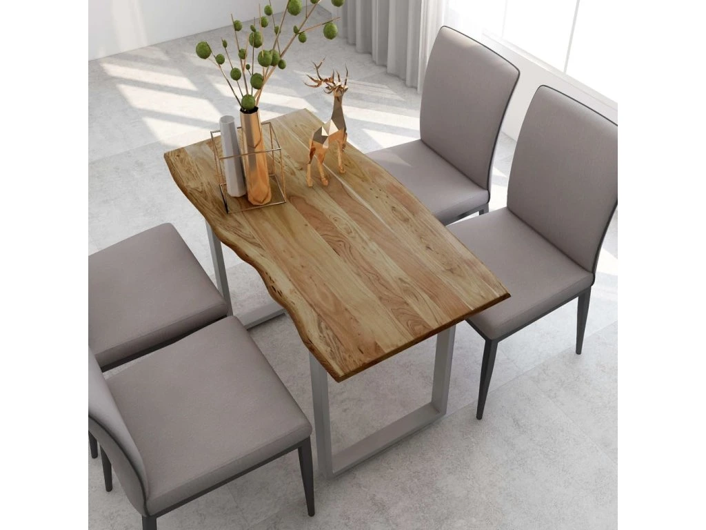 Tento jídelní stůl je vyrobený z masivní akácie, tropického tvrdého dřeva, které je oceňované pro svou pevnost a bohatou kresbu. Živý tvar a okraje stolní desky jsou záměrně opracované tak, aby do vašeho interiéru přinesly původní charakter a přirozený dojem stromu. Každý krok procesu se provádí s největší péčí, ať už jde o leštění, natírání nebo lakování. Ocelové nohy doplňují industriální vzhled a přispívají k robustní konstrukci.