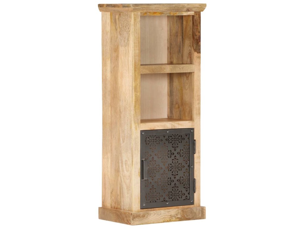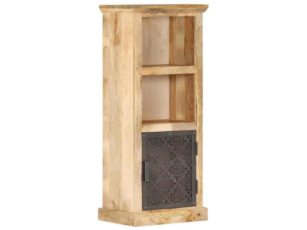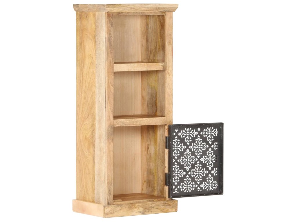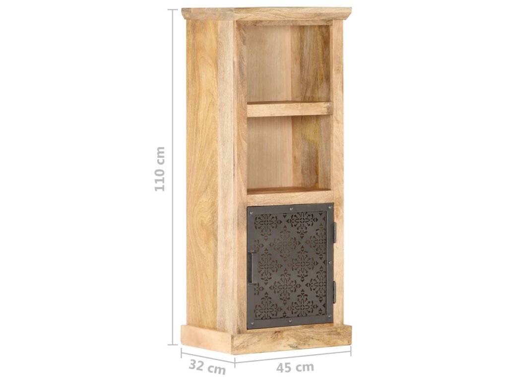 Tato vysoká skříňka z masivního mangovníkového dřeva byla zručně vyleštěná, natřená a nalakovaná a na první pohled zaujme svou nádhernou a rafinovanou povrchovou úpravou. Vyřezávaná ocelová dvířka ještě víc zdůrazňují její krásu. Ve dvou otevřených policích a v přihrádce s dvířky najdete dostatek úložného prostoru pro vaše knihy, časopisy, hrnkové rostliny, zarámované fotografie nebo další osobní potřeby.