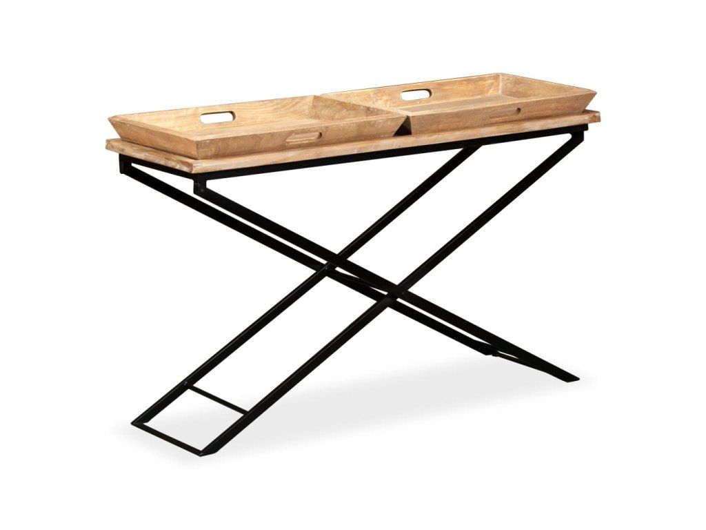 Deska stolu je vyrobena z masivního mangovníkového dřeva, které bylo obroušeno pro zvýšení jeho odolnosti. Nohy z oceli s práškovým nástřikem jsou navrženy do tvaru X, čímž je zajištěna perfektní stabilita stolku. Stolek disponuje dvěma dřevěnými podnosy, jež se výborně hodí k vystavování dekorativních předmětů jako jsou košíky s ovocem a vázy. V případě potřeby se dají snadno sejmout, takže je můžete používat i odděleně. Montáž je snadná.
