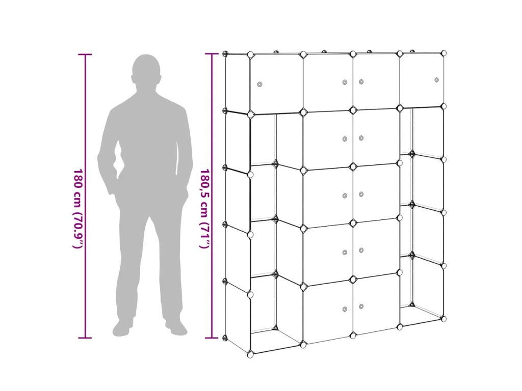 Šatník je vyroben z plastových elementů a chromovaného ocelového drátu, takže se snadno čistí. Vzhledem ke svému promyšlenému designu se skříň dá snadno a rychle složit v různém uspořádání, aby se přizpůsobila prostoru nebo vaší náladě.