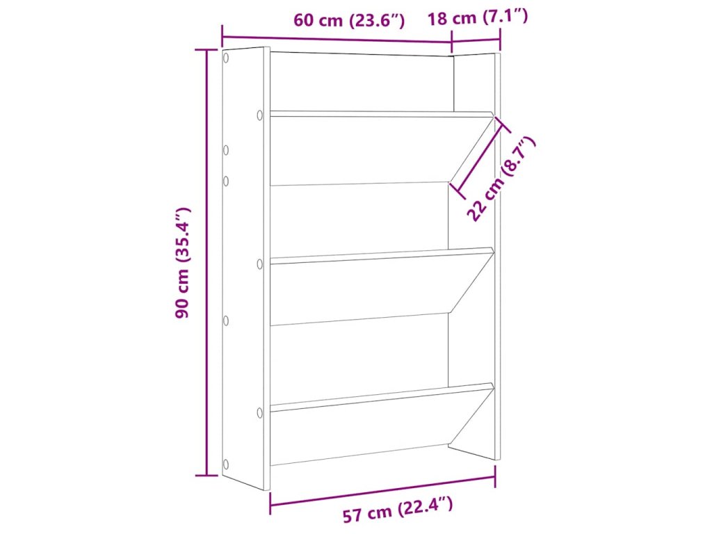 Botník je vybaven 3 výklopnými policemi, které nabízí přehledný a praktický úložný prostor pro boty nebo pantofle. Botník se montuje na stěnu, což vám ušetří místo a ve vstupní místnosti tak snadno udržíte pořádek. Lze jej upevnit v jakékoli požadované výšce. Navíc se snadno čistí vlhkým hadříkem.