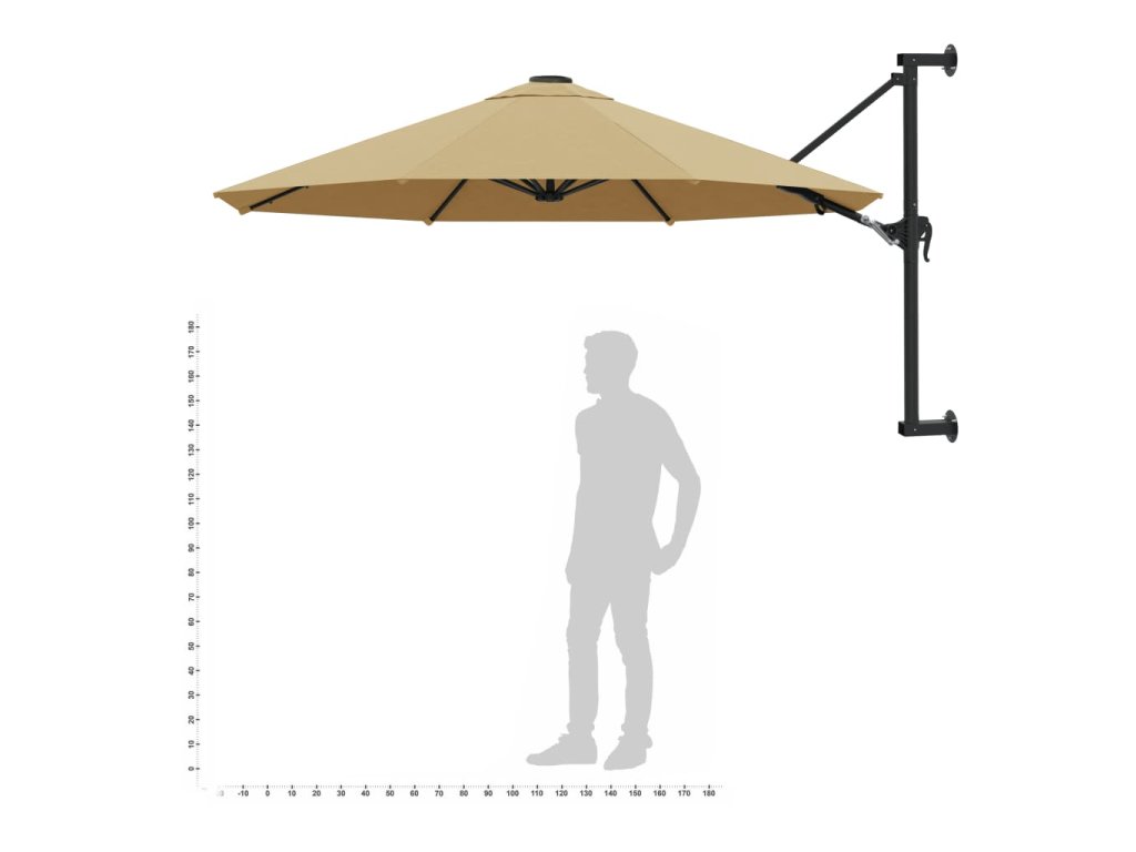Upozornění: Pokud bude slunečník vystavený silnému dešti, doporučujeme ho ošetřit impregnací. Výška tohoto nástěnného slunečníku závisí na výšce jeho upevnění na zeď.
