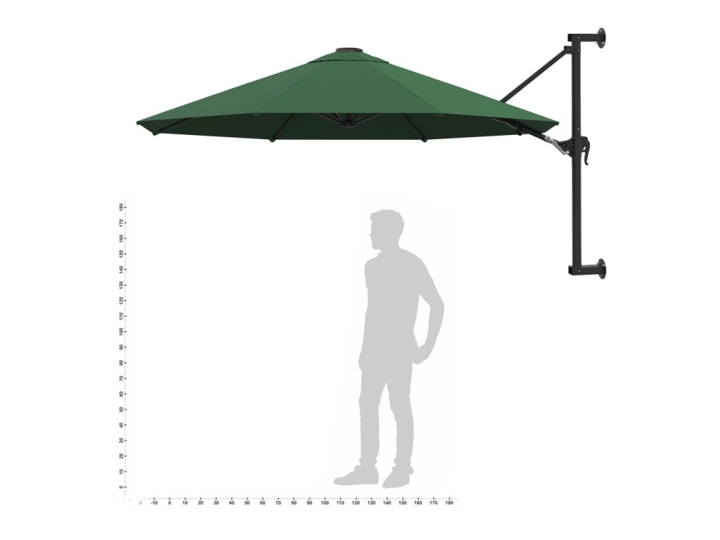 Upozornění: Pokud bude slunečník vystavený silnému dešti, doporučujeme ho ošetřit impregnací. Výška tohoto nástěnného slunečníku závisí na výšce jeho upevnění na zeď.