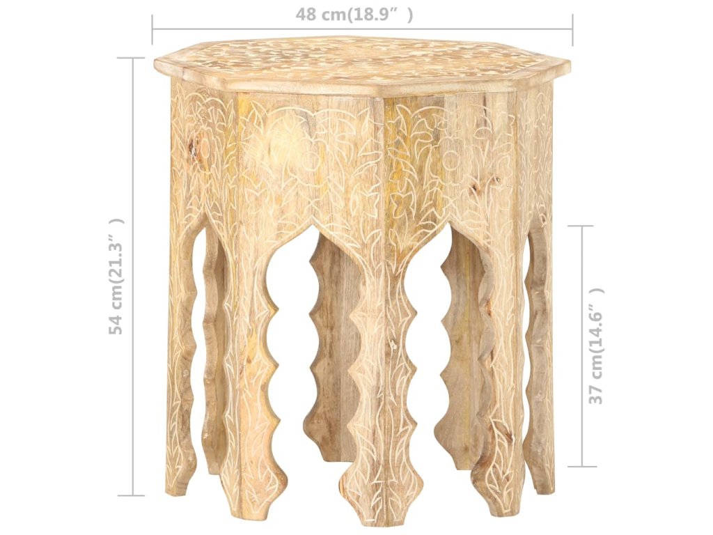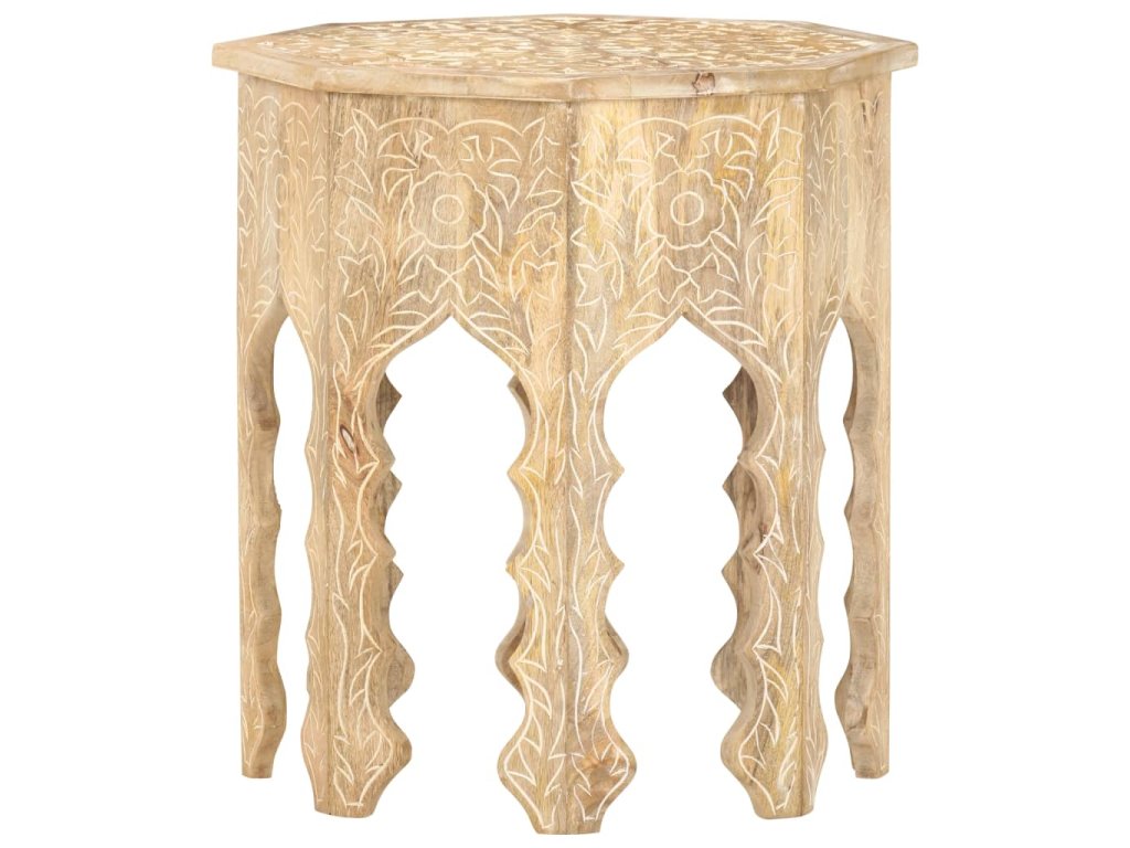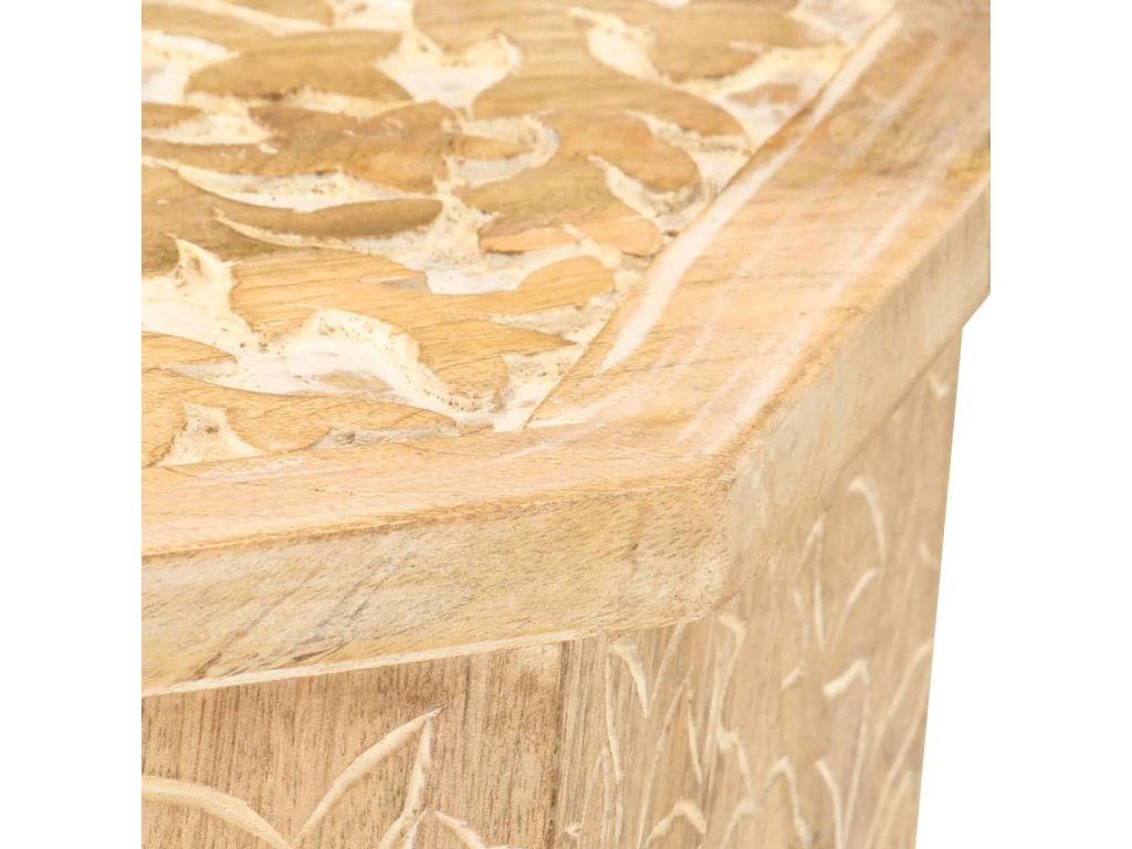 Masivní mangovník je tropické tvrdé dřevo. Toto dřevo jednak unese značnou váhu a jednak výborně odolává zubu času. Precizní řemeslné zpracování a nádherná kresba dřeva navíc jednotlivé stolky k pohovce vzájemně odlišují, takže nenajdete dva stejné. Masivní stolní deska je bezpečná odkládací plocha pro celou řadu věcí. Co víc, ručně vyřezávaný vzor zdůrazňuje krásu tohoto dřevěného nábytku.