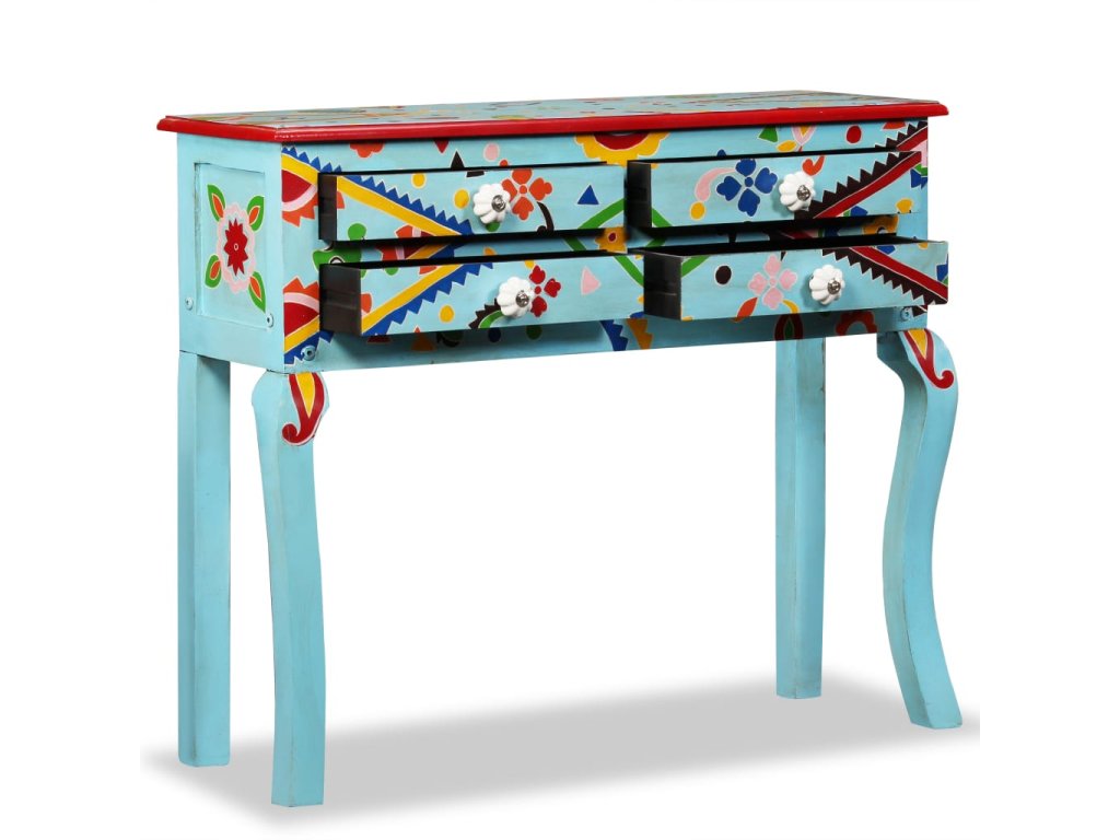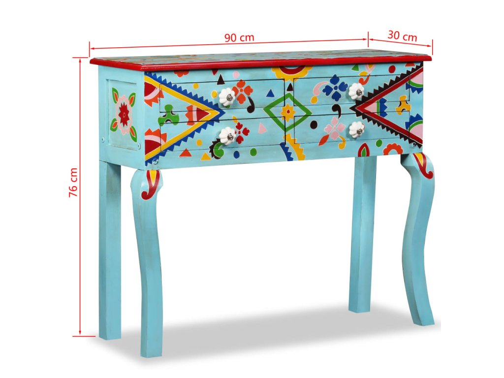 Tento stolek pod TV je vyroben z mangovníkového dřeva, které je nejen líbivé, ale také velmi odolné. Jeho retro vzhled navíc podtrhuje zručné řemeslné zpracování. Stolek je ručně malovaný. Jeho bohaté zdobení z něj činí elegantní, rafinovaný kousek. Úchytky, které se k němu perfektně hodí, usnadňují otevírání zásuvek.