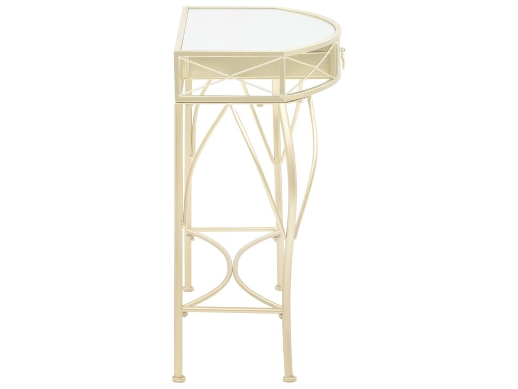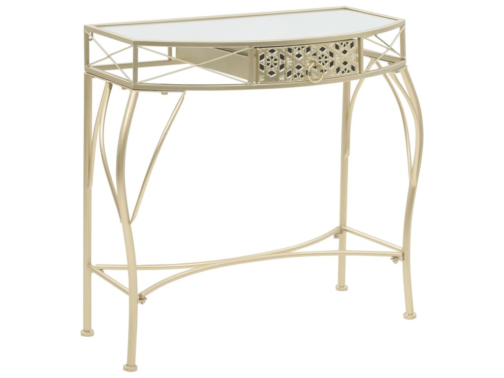 Stolek má kovový rám a skleněnou stolní desku, je stabilní a snadno se čistí. Odkládací stolek disponuje zásuvkou, která je zdobená vkusnými ornamenty, jež stolku propůjčují starožitný vzhled a vnesou do vašeho domova nádech elegance. Montáž výrobku je snadná.