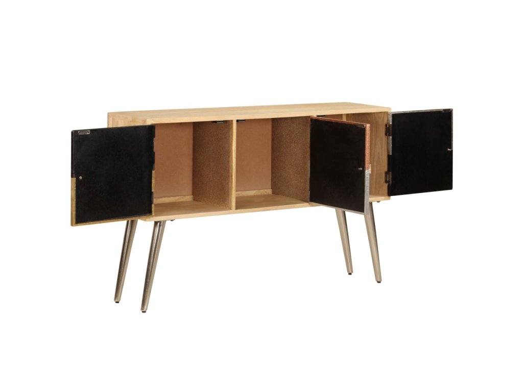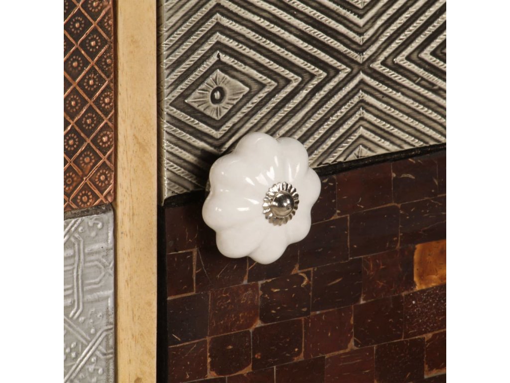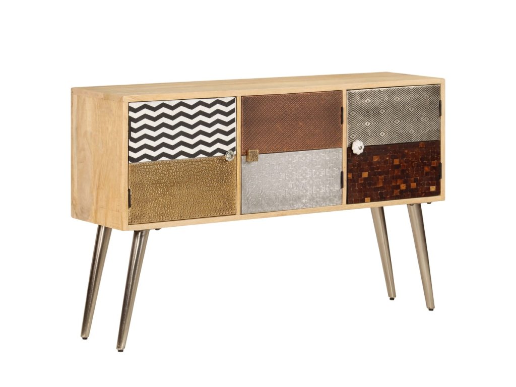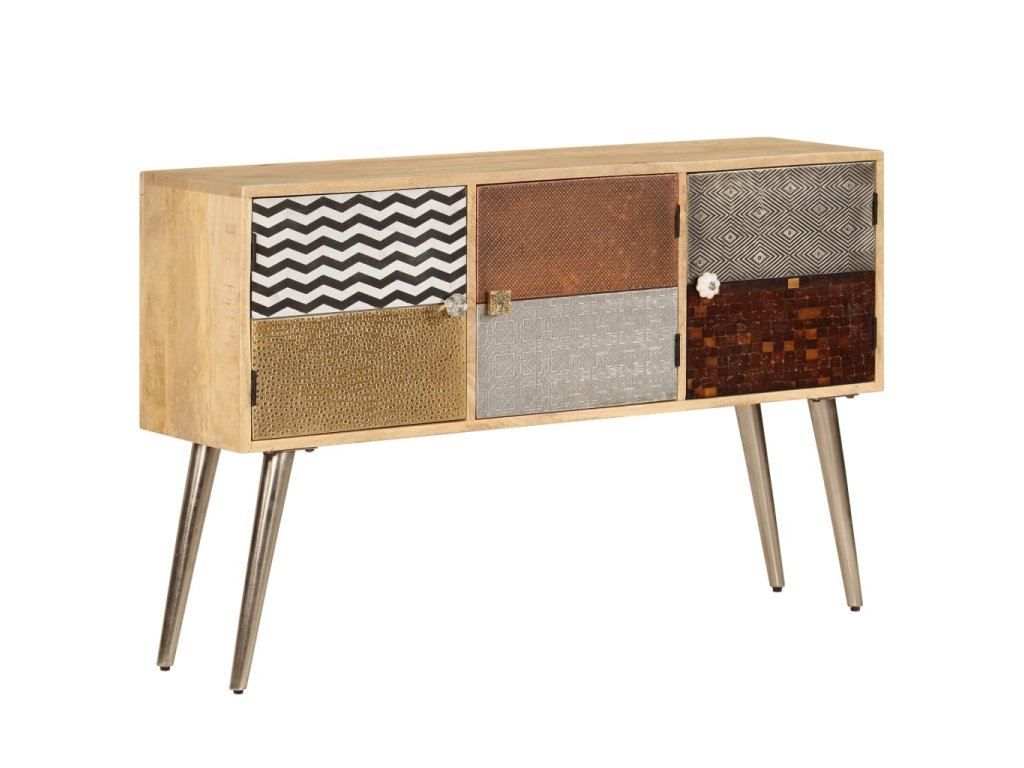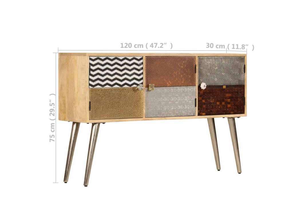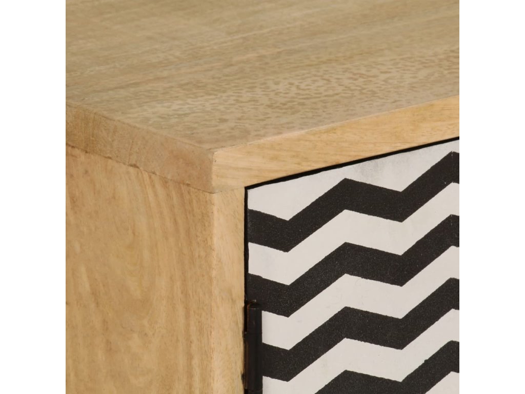 Příborník je vyroben z masivního mangovníkového dřeva a je vysoce stabilní a odolný. Pevná horní deska se skvěle hodí k vystavení dekorativních předmětů, jako jsou vázy či květináče. Skříňka vám poskytne spoustu úložného prostoru pro přehledné uspořádání nejrůznějších věcí. Originální dekorativní vzory umocňují její moderní šarm. Sestavení výrobku je snadné.