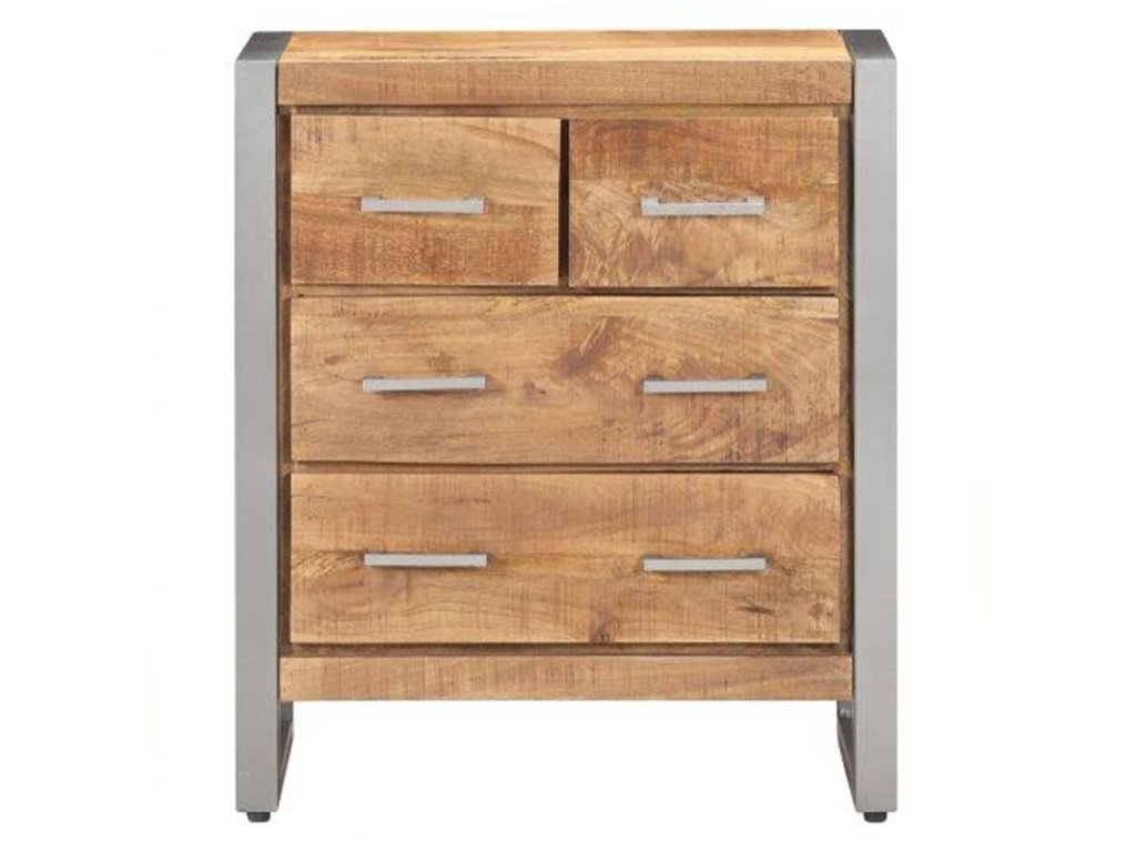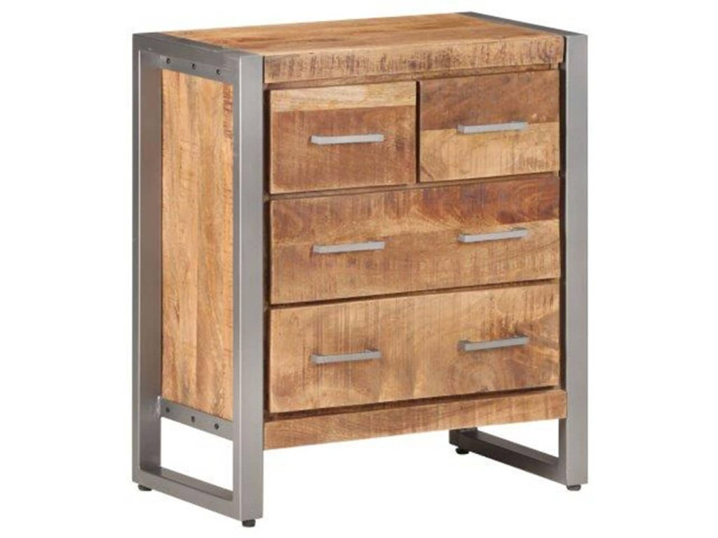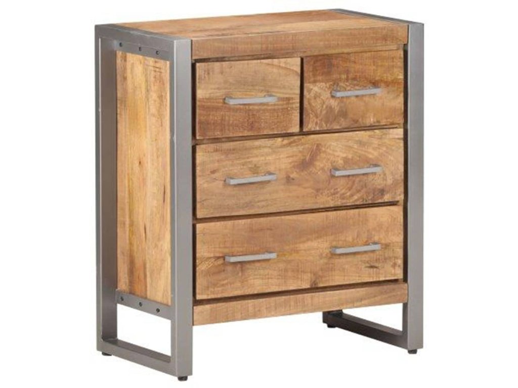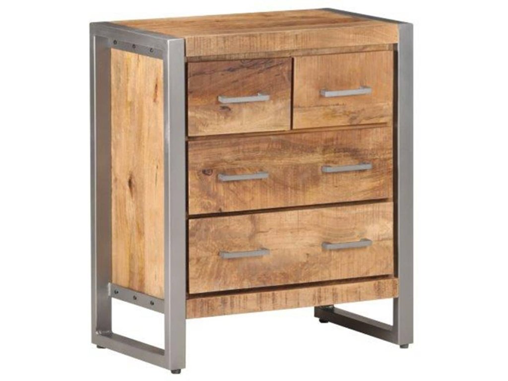Odkládací skříňka je vyrobená z hrubého masivního mangovníku. Toto tropické tvrdé dřevo dokáže unést značnou váhu a skvěle odolává zubu času, takže je velice stabilní a dlouho vám vydrží. Železný rám přispívá ke stabilitě skříňky. Ve skříňce jsou čtyři zásuvky, ve kterých najdete spoustu úložného prostoru. Bytelná horní deska je perfektní k vystavení nejrůznějších dekorací, jako jsou zarámované fotografie, pokojové rostliny, vázy apod.