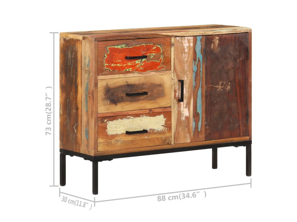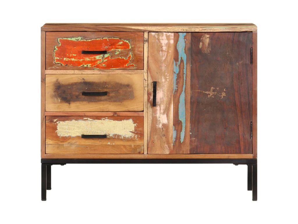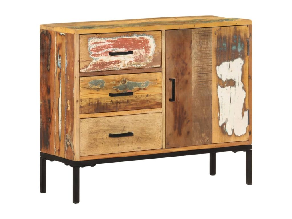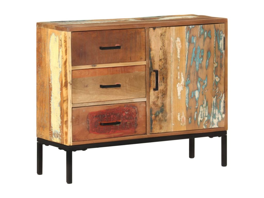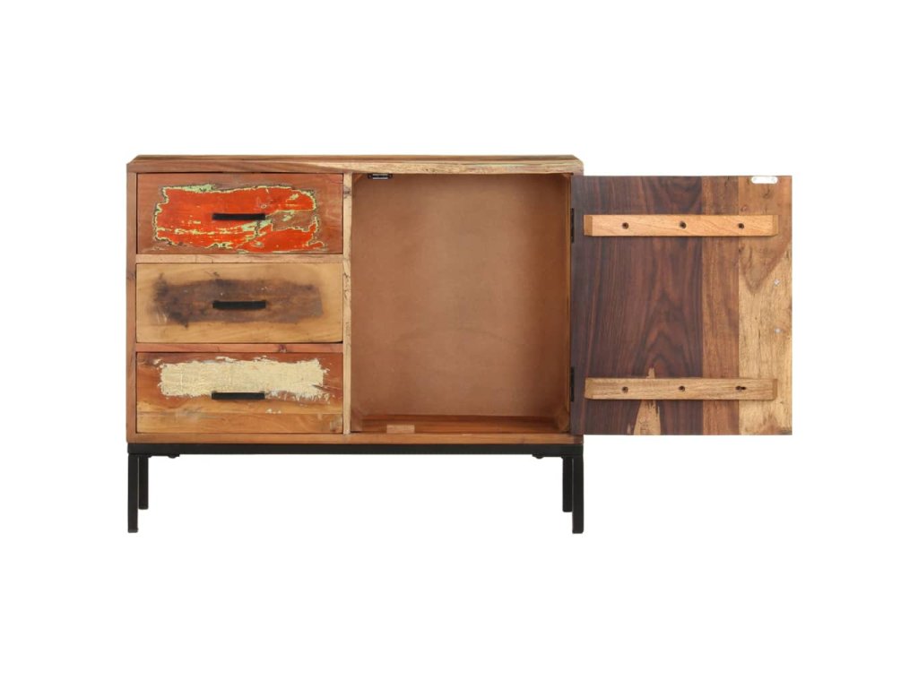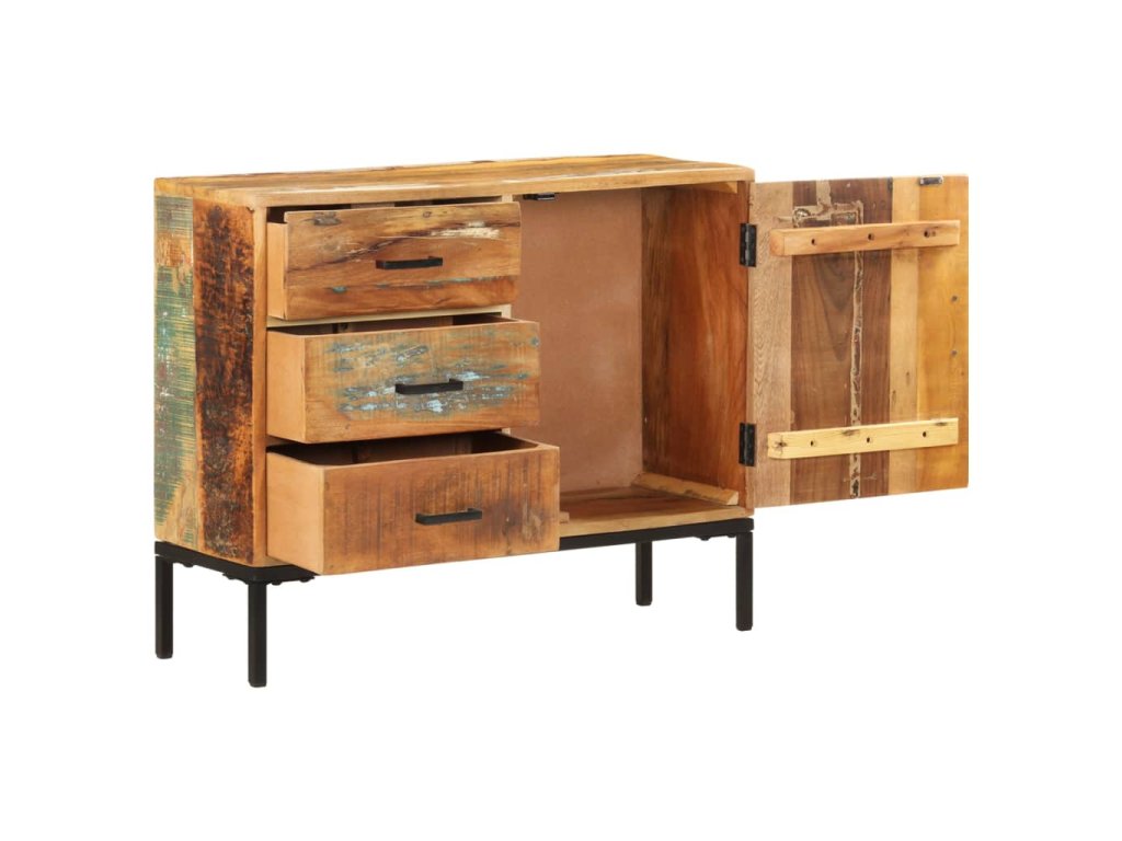 Tato skříňka je vyrobena z masivního recyklovaného dřeva, které pochází z trámů, nosných trámů a podlah ze starých a zbouraných budov. Jedná se tedy o ekologicky šetrný způsob výroby nábytku. Směs recyklovaného dřeva zahrnuje borovici, týk, buk, mangovník atd. To znamená, že regenerovaný materiál si zachovává vlastnosti těchto různých druhů dřeva. Železný rám s práškovým nástřikem dodává nábytku větší stabilitu. Boční skříňka je vybavena 3 zásuvkami a 1 dvířky, díky kterým budou knihy, časopisy a další předměty dobře uspořádané a váš pokoj zůstane uklizený. Horní robustní deska je navíc ideální pro vystavení dekorativních předmětů, rámečků na fotografie nebo květináčů.