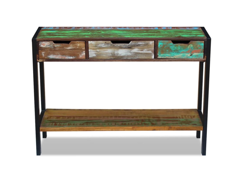 Tato úložná truhla ve vintage stylu je vyrobená z masivního recyklovaného dřeva, stane se tedy nadčasovým doplňkem vašeho domova. Vzhledem k pevnému ocelovému rámu je odkládací stolek velmi stabilní a odolný. Horní deska nabízí stabilní a bezpečný povrch, na který si můžete odložit nápoje a nebo si zde vystavit koš s ovocem, vázy či jiné dekorace. Je vybaven třemi zásuvkami, které vám poskytnou dostatek prostoru pro uložení drobných předmětů, jako jsou klíče, poznámkové bloky a další drobnosti. Na spodní poličce najdete další místo k uspořádání vašich věcí.