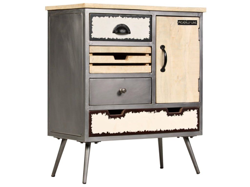 Příborník je vyroben z masivního mangovníkového dřeva, které bylo vyleštěno, natřeno a nalakováno. Překrásná povrchová úprava dřeva mu propůjčuje rafinovaný vzhled. Díky nádherné kresbě dřeva je každý kus zcela jedinečný a lehce odlišný od ostatních. Tato úložná skříňka má pevný a stabilní povrch, na který můžete pokládat košík s ovocem, vázu či jiné dekorativní předměty. Je vybavena 4 zásuvkami a 1 skříňkou, které vám poskytnou dostatek prostoru pro vaše knížky a další maličkosti. Ocelový rám dodá skříňce robustnost a industriální šarm. Montáž je snadná.